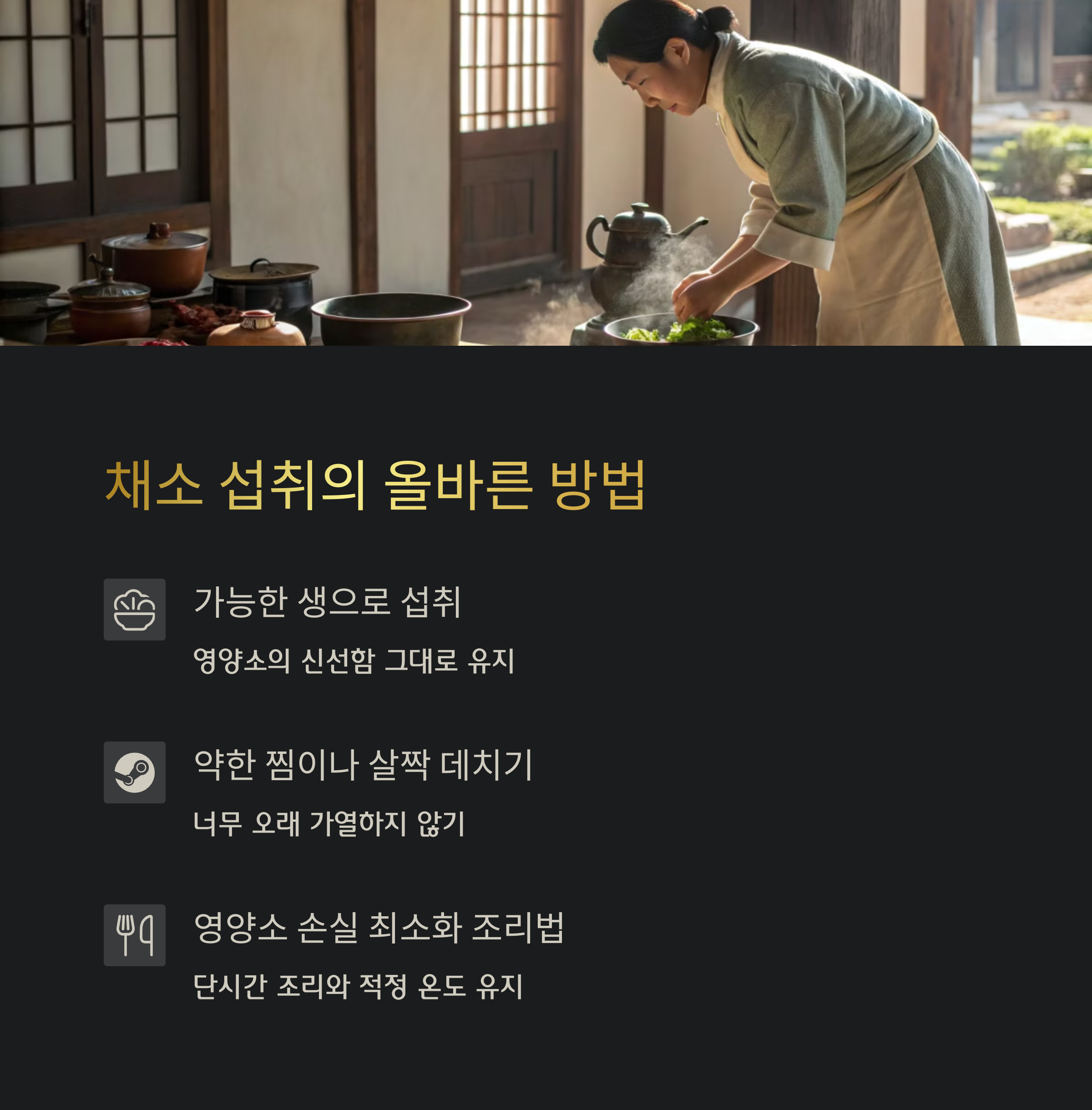 채소는 가능하면 익히기보단 생으로 섭취하거나, 수분 손실을 줄인 스팀 조리 방식이 가장 이상적입니다. 또한 식사 시 편식하지 않고 다양한 색의 채소를 골고루 섭취하는 것이 면역력 강화를 위한 가장 확실한 방법입니다.