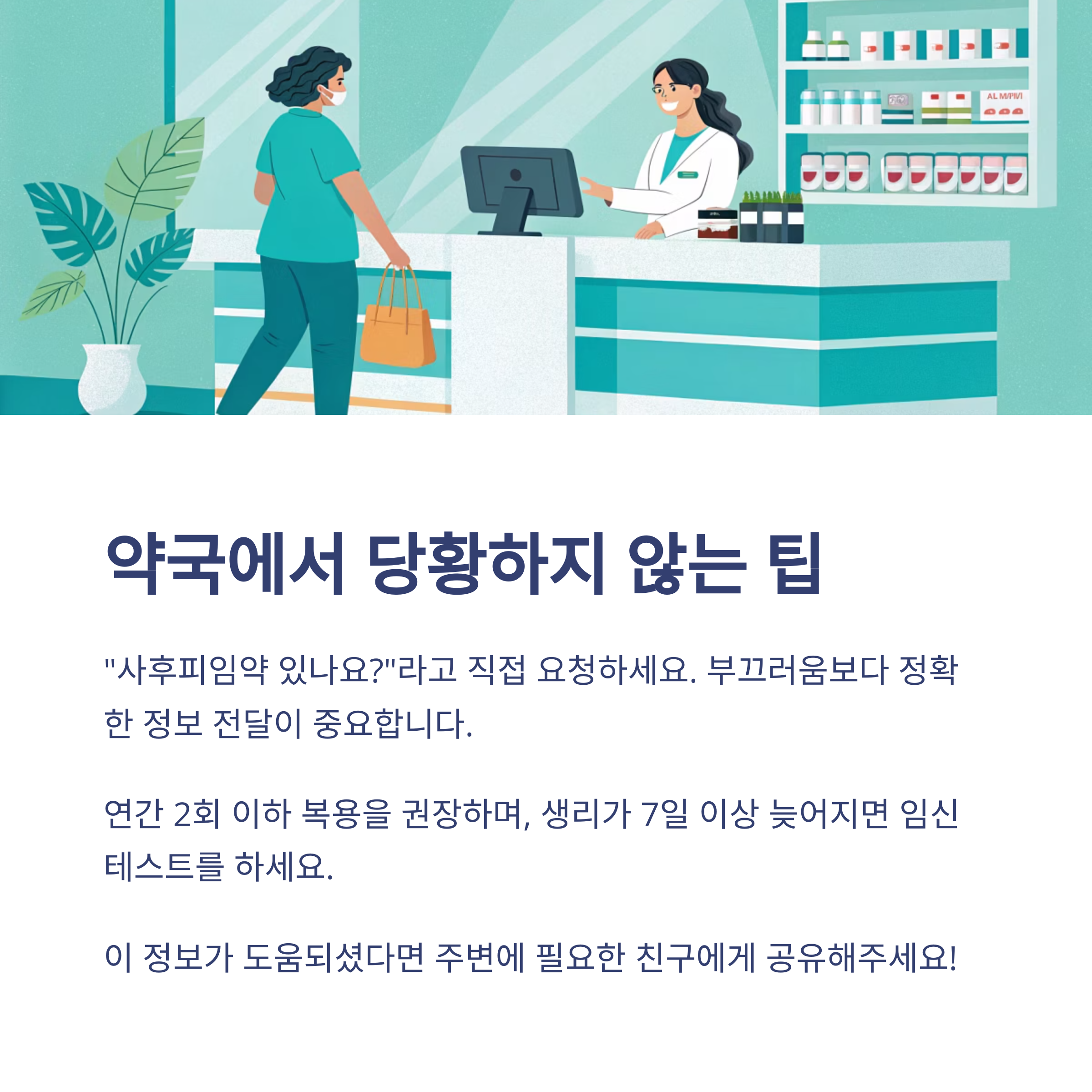 ※ 사후피임약은 응급 피임용으로 1년에 2회 이하 복용을 권장합니다. 지속적인 피임이 필요하다면 전문의 상담을 통해 다른 피임 방법을 고려하세요.