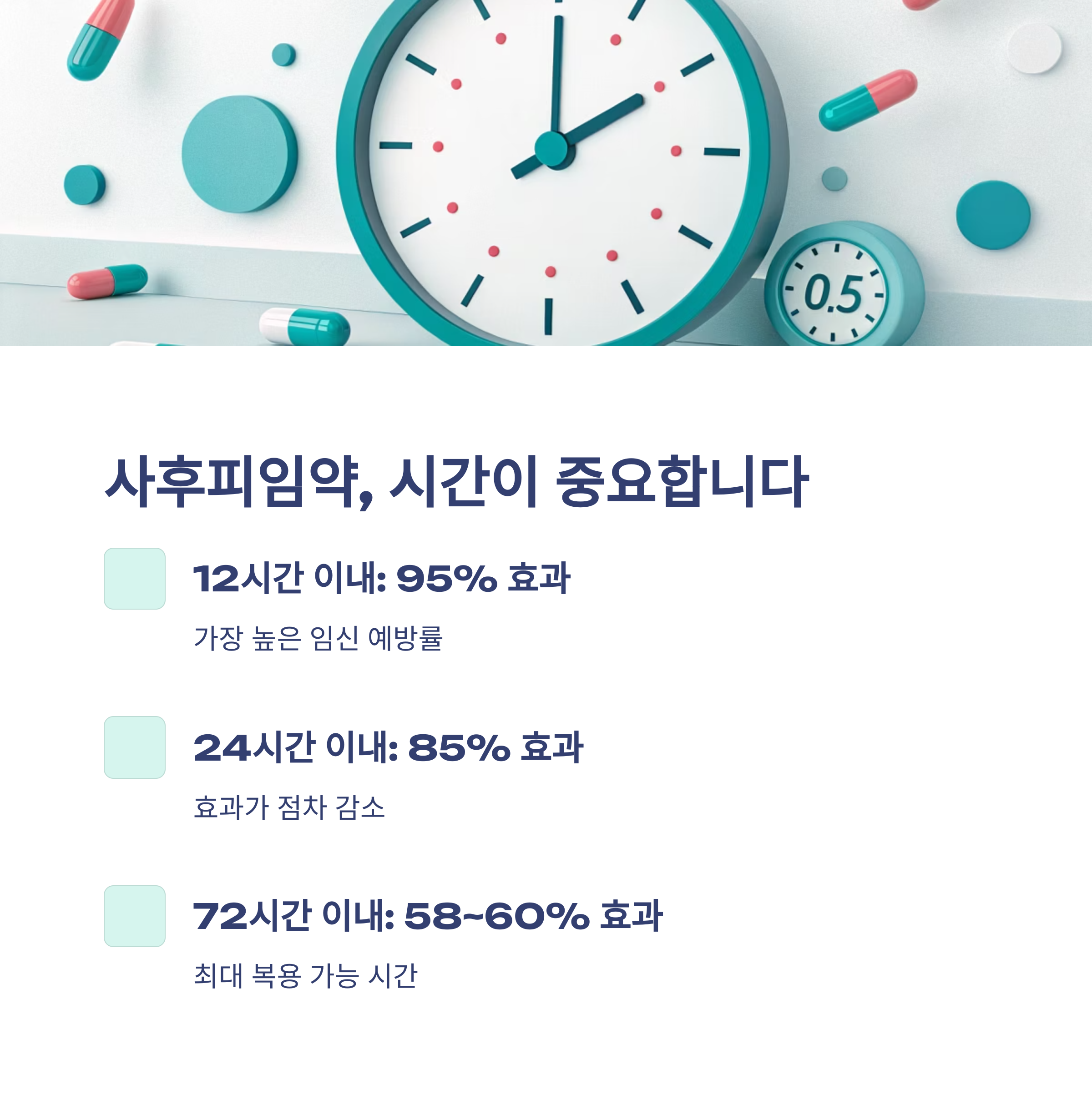 사후피임약의 효과는 복용 시점에 따라 58%에서 95%까지 차이가 날 수 있습니다. 특히 관계 후 12시간 이내 복용할 경우 가장 높은 효과를 기대할 수 있으며, 72시간 이내 복용이 권장됩니다. 일종의 '시간과의 싸움'인 셈입니다.