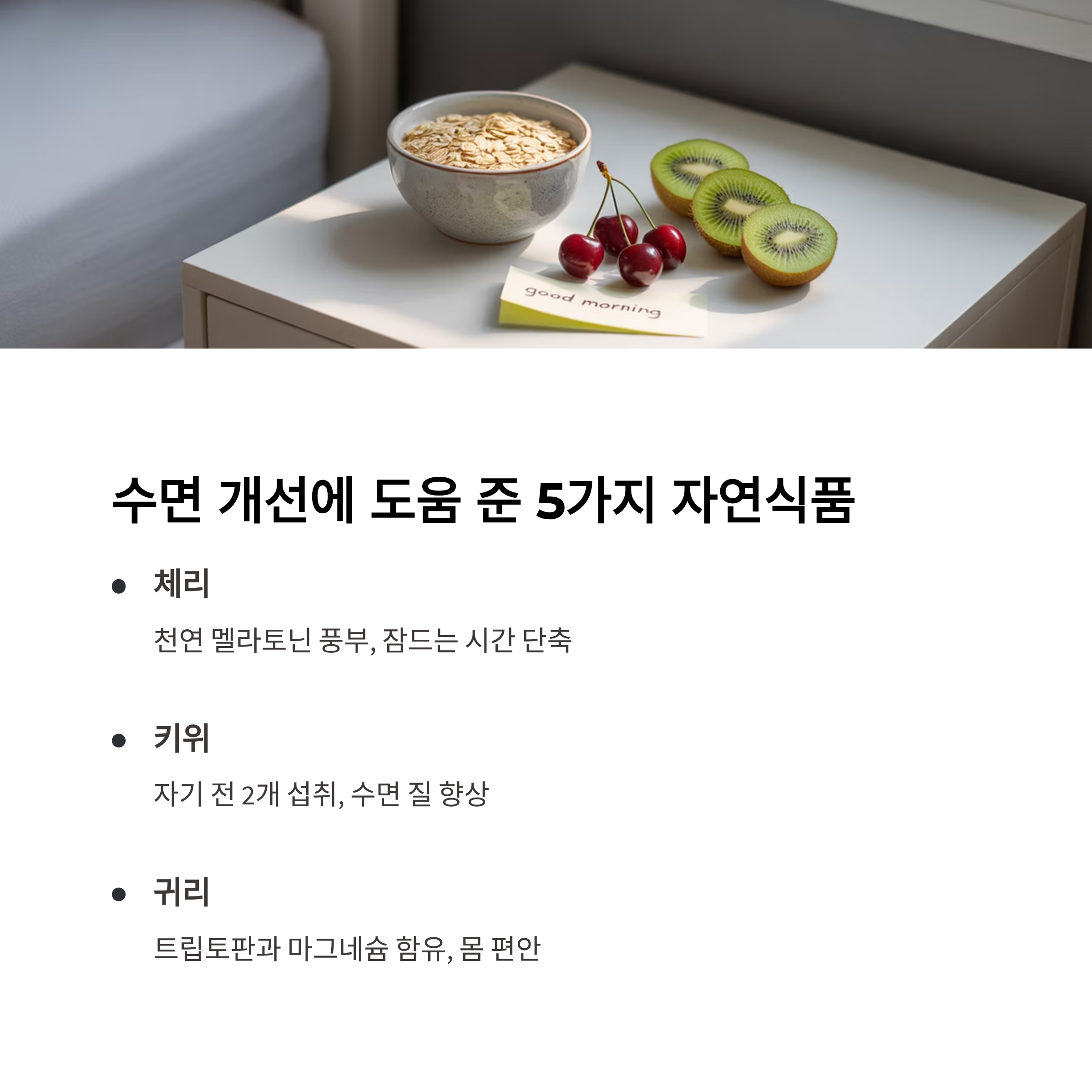 수면 보조제를 계속 복용하는 것이 불안하던 찰나, 자연식품이 수면에 도움이 된다는 정보를 접하게 되었어요. 특히 특정 식품에는 멜라토닌이나 트립토판, 마그네슘 등의 수면 유도 성분이 풍부하다는 사실이 흥미로웠죠. 무엇보다 식사 속에서 자연스럽게 섭취할 수 있고, 부작용 걱정도 적다는 점이 가장 큰 장점이었습니다.