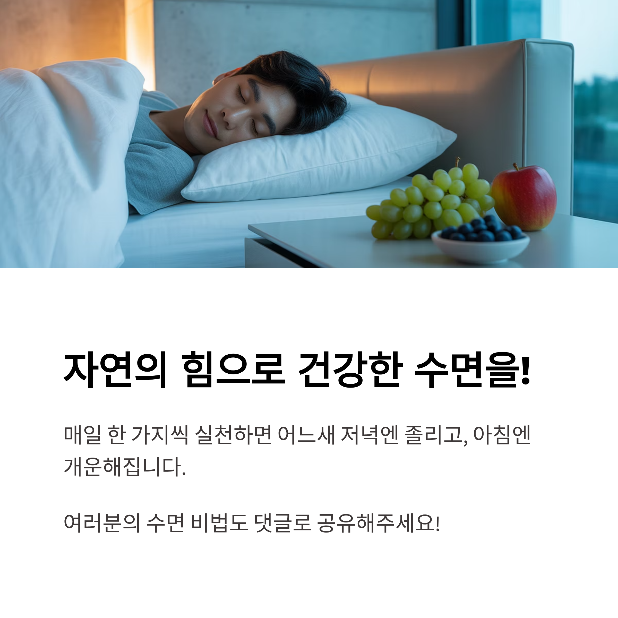 불면으로 지친 날들, 저는 자연식품을 통해 조금씩 회복할 수 있었습니다. 처음엔 반신반의했지만, 매일 한 가지씩 실천하다 보니 어느새 저녁이면 졸리고, 아침엔 개운한 자신을 발견하게 되었어요. 수면 보조제가 아닌 자연의 힘으로도 충분히 바뀔 수 있다는 믿음을 가지셨으면 좋겠습니다. 여러분도 자신만의 수면 루틴을 찾아보시고, 이 경험이 도움이 되셨다면 댓글로 공유해 주세요. 함께 더 나은 밤을 만들어가요!