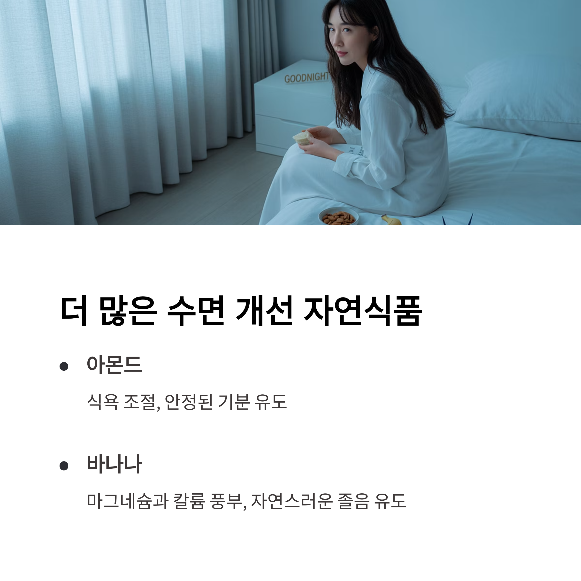 - 바나나: 천연 마그네슘과 칼륨이 풍부해 잠이 솔솔 와요.