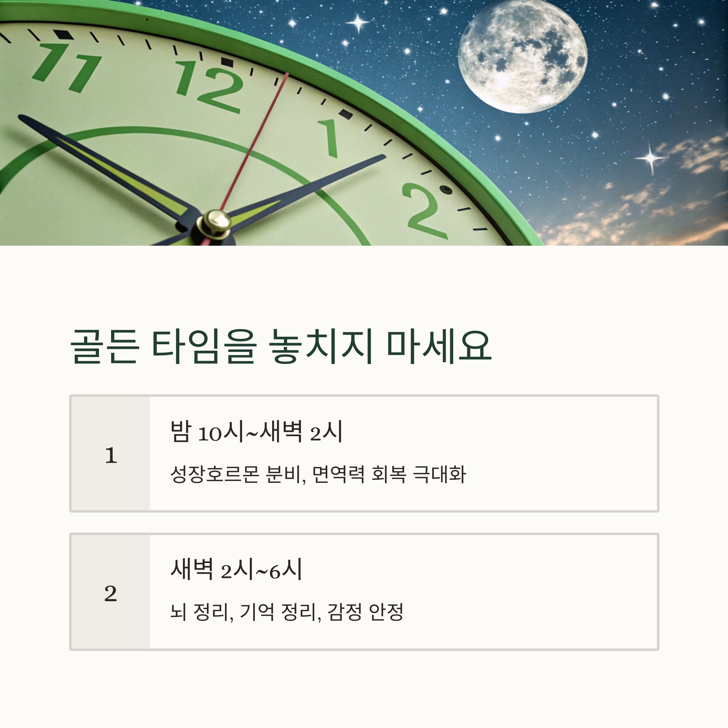 두 번째는 '수면의 시간대'입니다. 밤 10시부터 새벽 2시까지는 흔히 '수면의 골든 타임'이라 불리는 시간대예요. 이 시간대에 잠들면 성장호르몬 분비가 활발하고, 면역력 회복도 극대화됩니다. 밤늦게 자고 아침에 늦게 일어난다고 해도 수면의 질은 이 시간대와 비교할 수 없을 만큼 떨어져요.