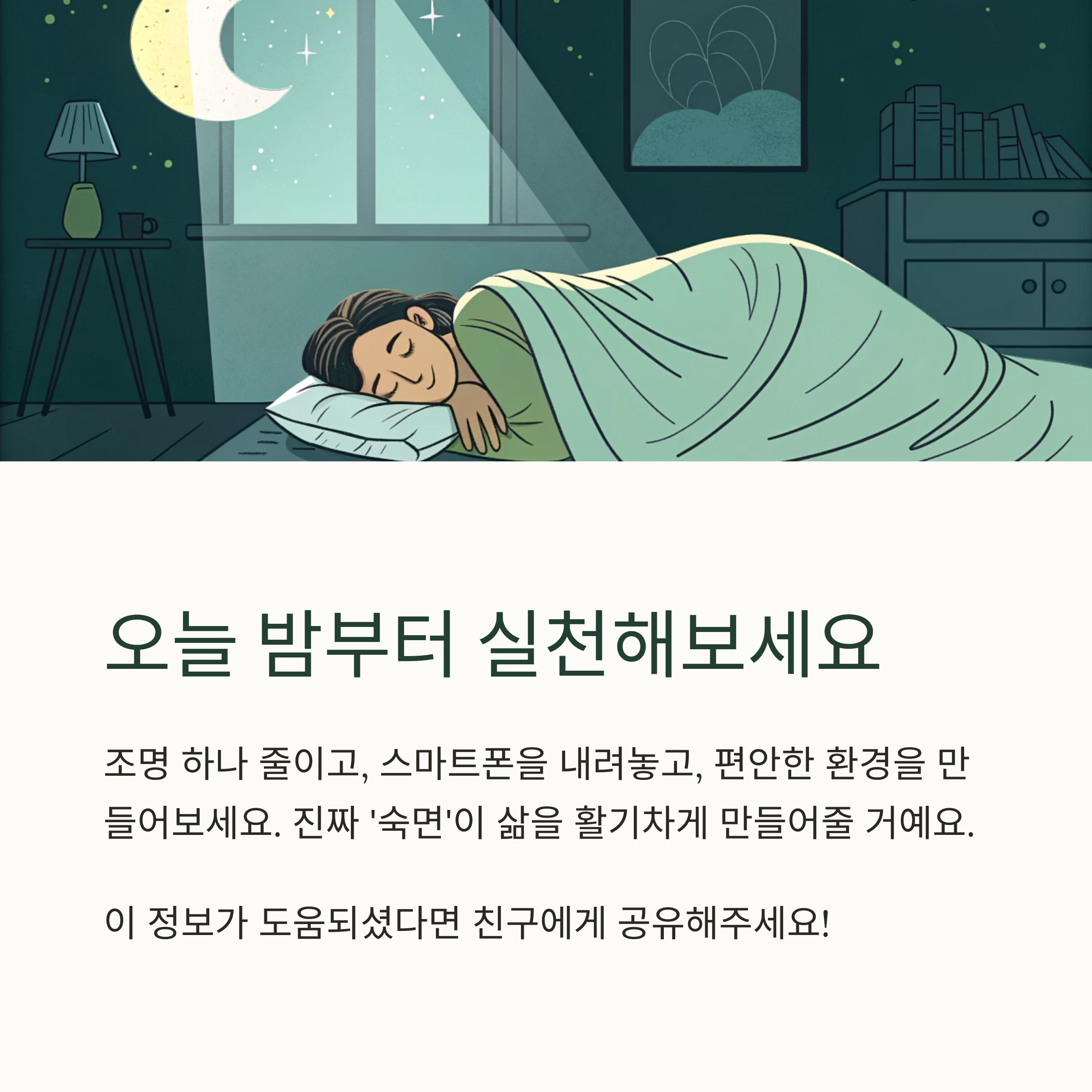수면 시간보다 더 중요한 건 바로 '어떻게 자느냐'입니다. 수면의 질을 조금만 의식해도 하루의 피로감, 집중력, 심지어 기분까지 놀랍도록 달라질 수 있어요. 오늘부터라도 조명 하나 줄이고, 스마트폰을 잠시 내려놓고, 내 몸이 편안히 쉴 수 있는 환경을 만들어 보세요. 더 깊은 잠이 여러분의 삶을 훨씬 더 활기차게 만들어줄 거예요. 오늘 밤, 진짜 ‘숙면’ 하시길 바랍니다.