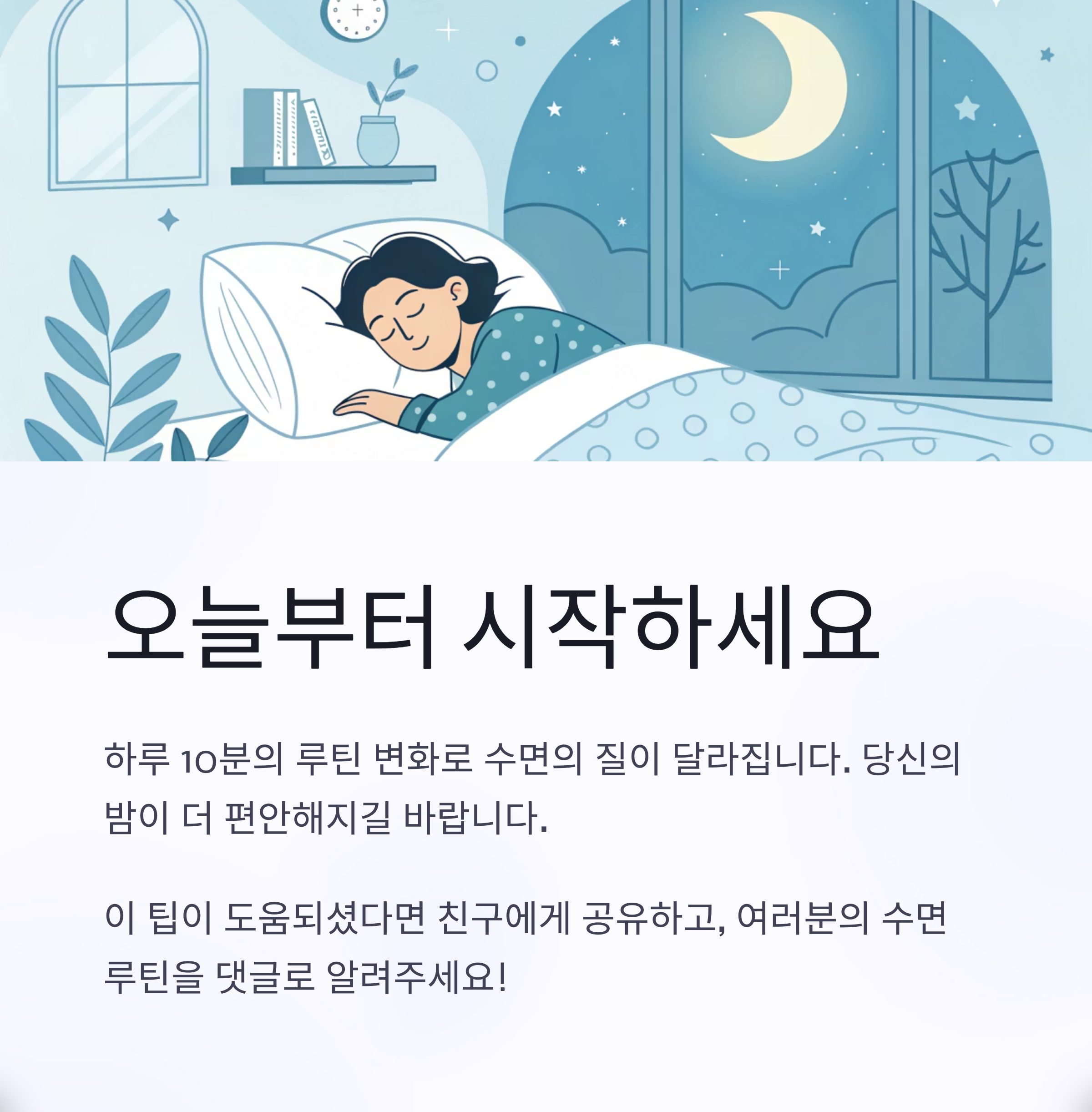불면증으로 뒤척이던 시절, 제일 괴로웠던 건 '내일 어떻게 버티지'라는 불안감이었어요. 그런데 매일 같은 시간에 샤워하고, 음악을 틀고, 블루라이트를 차단하는 작은 루틴을 만들고 나서 정말 달라졌습니다. 수면의 질은 하루의 질을 바꾸고, 나아가 삶 전체를 회복시켜 줘요. 오늘부터 단 10분, 나만의 수면 습관을 만들어보세요. 당신의 밤이 조금 더 편안해지기를 진심으로 바랍니다.
