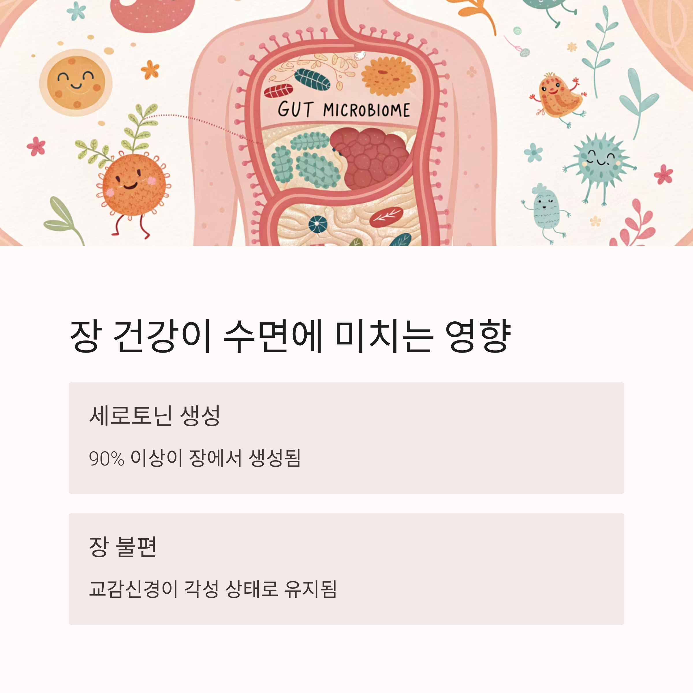 장은 수면과도 깊은 연관이 있습니다. 세로토닌과 멜라토닌 같은 수면 호르몬은 대부분 장에서 생산되며, 장내 미생물 균형은 수면의 질을 좌우합니다. 장이 좋지 않으면 수면도 얕아질 수밖에 없습니다.