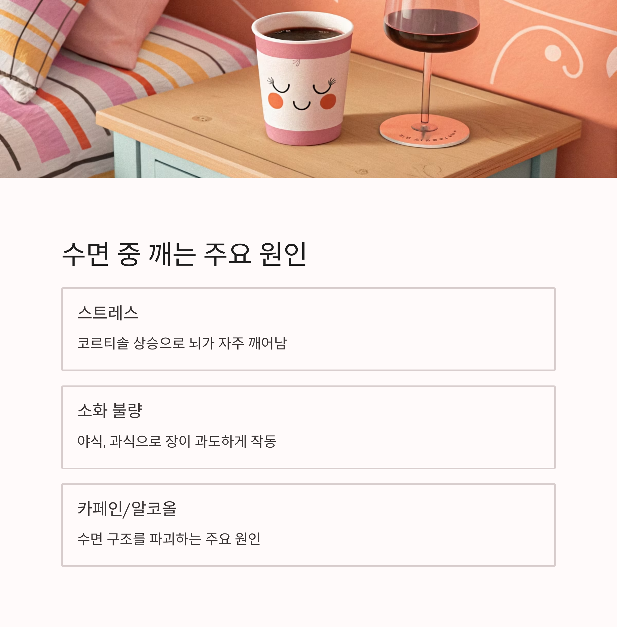 | 수면 중 자주 깨는 이유, 5가지 단순한 원인과 해결 행동법 (2) | 2025.07.24 |