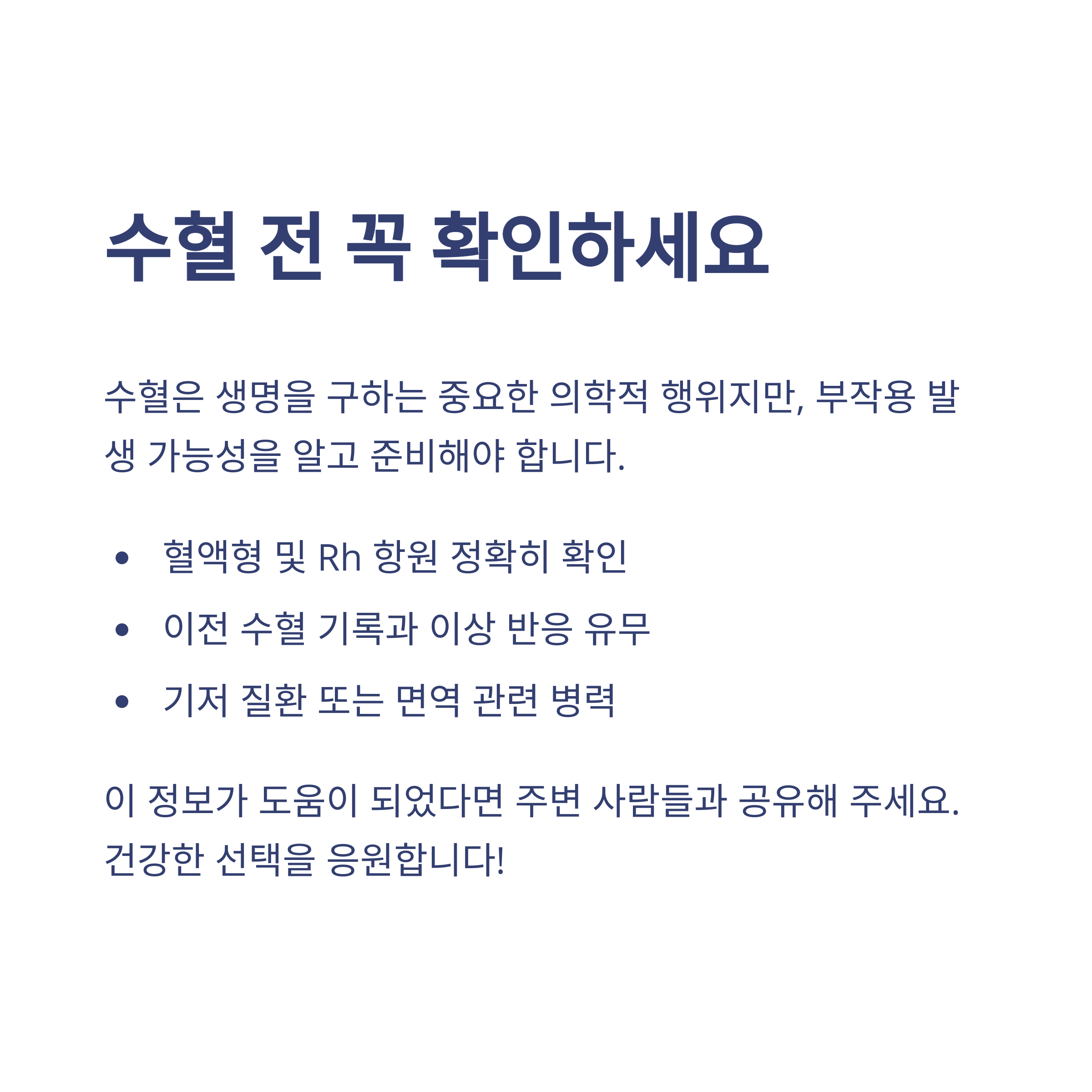이전 수혈 기록, 알레르기 병력, 현재 상태 등을 의료진에게 충분히 공유하는 것이 예방의 첫걸음입니다.