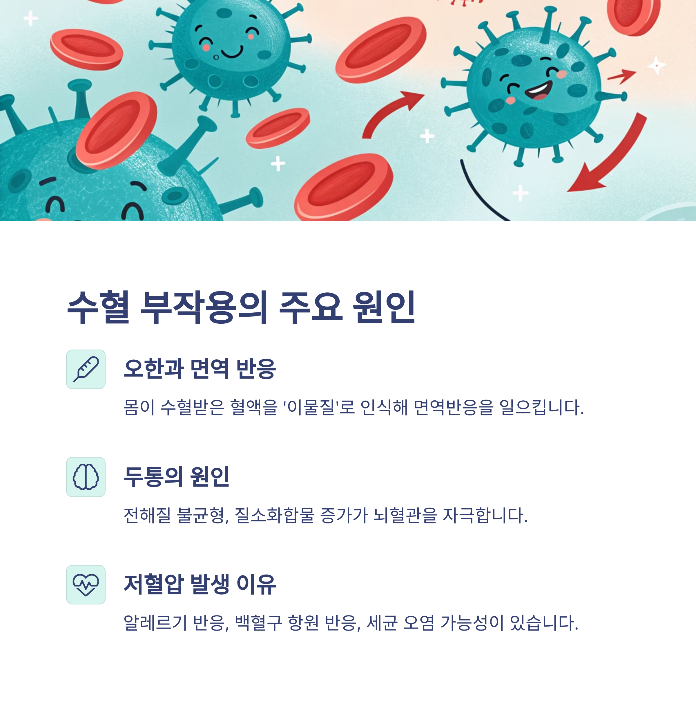 수혈이라는 행위는 단순히 피를 몸에 넣는 일이 아니라, 면역 시스템과의 협상이라고 볼 수 있습니다. 내 몸이 ‘나 아닌 타인의 세포’를 얼마나 관대하게 받아들이느냐에 따라 부작용의 양상이 달라집니다.