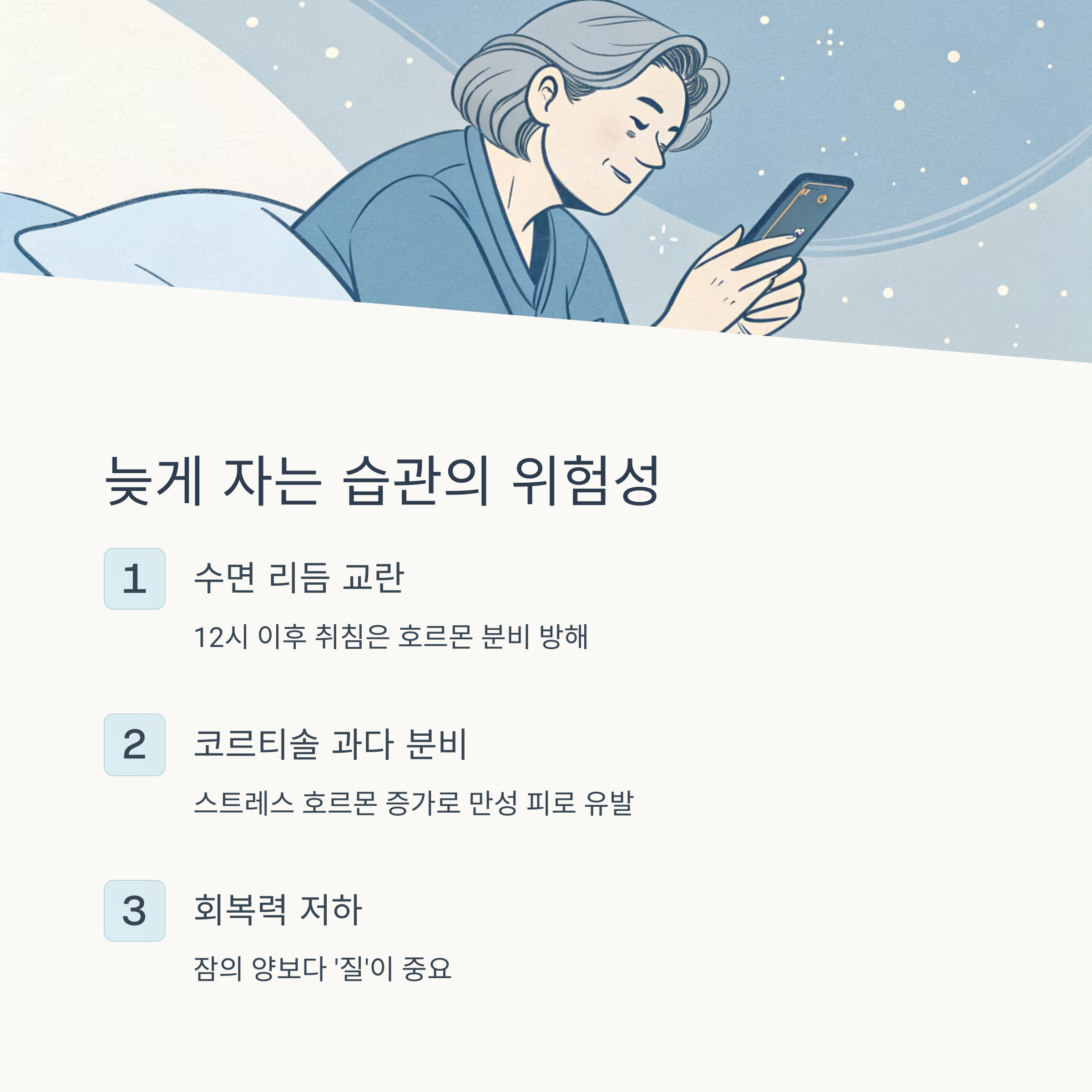 또한 늦게 자는 사람들은 불규칙한 생활로 인해 스트레스 호르몬인 코르티솔이 과도하게 분비되면서, 만성 피로나 면역력 저하로 이어질 수 있어요. 결국 잠의 양보다 ‘질’이 중요한 것이죠. 하루 6시간을 자더라도 밤 10시에 잠든 수면이, 밤 2시에 잠든 8시간 수면보다 훨씬 더 회복력이 좋을 수 있다는 사실을 기억하세요.