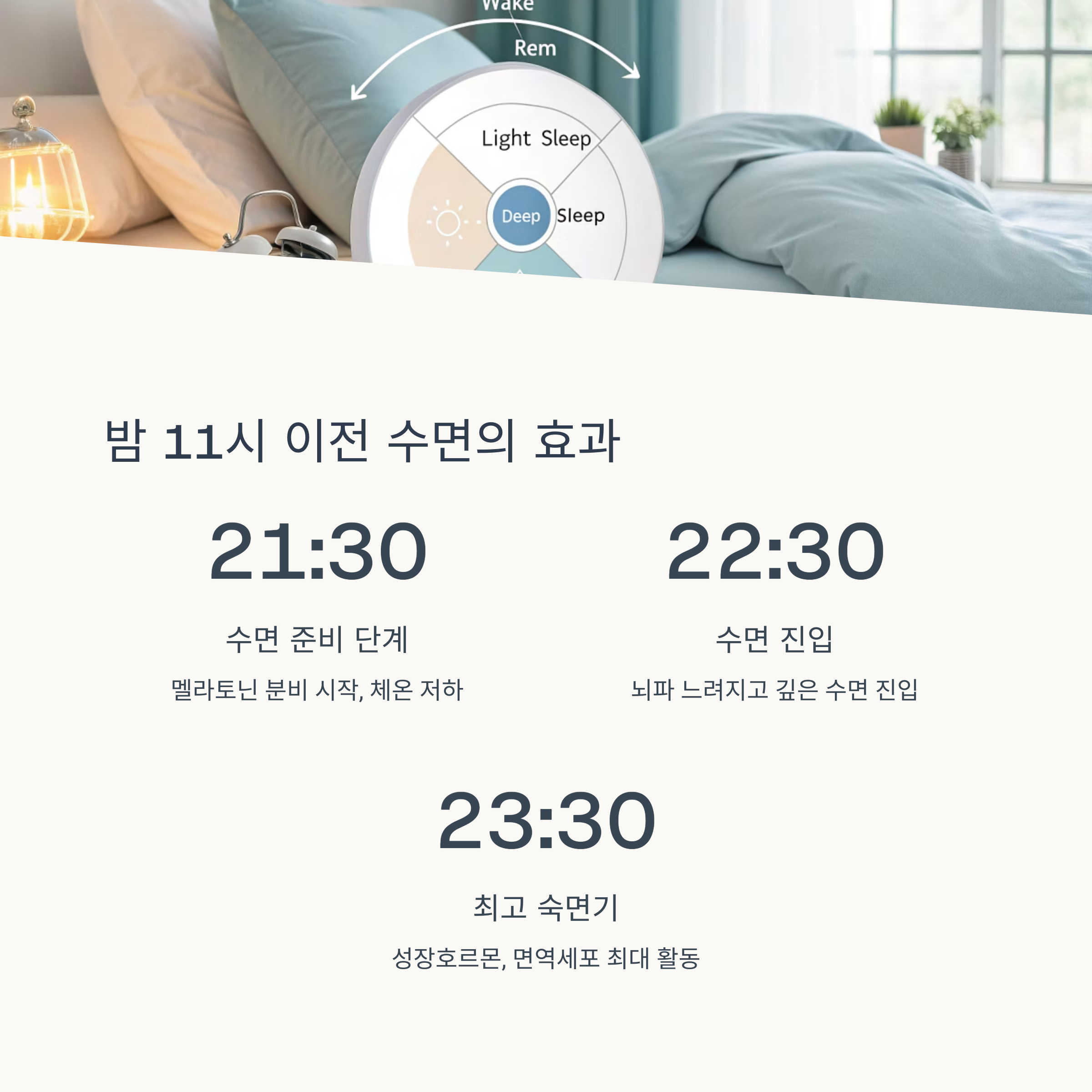 수면의 '양'보다 '질'이 중요합니다. 밤 11시 이전에 자는 것이 숙면 리듬에 가장 이상적입니다.