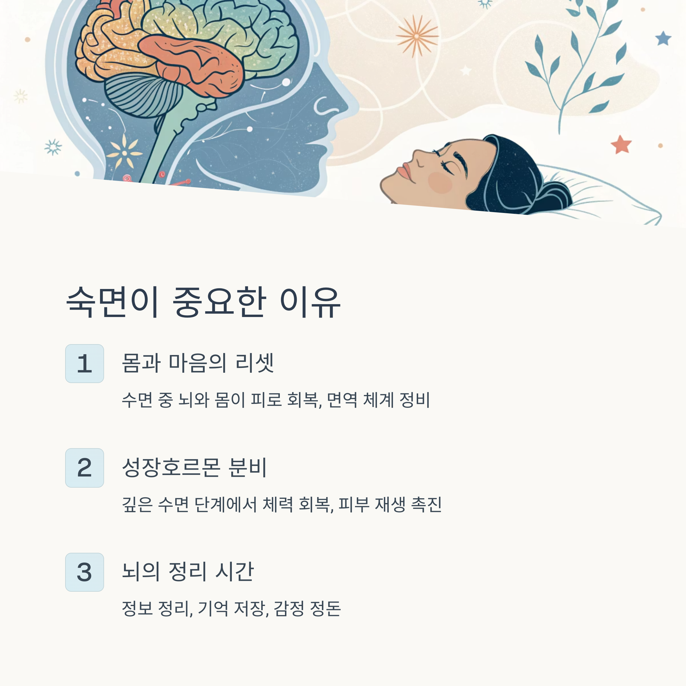 수면은 단순한 ‘쉬는 시간’이 아닙니다. 숙면 중에는 뇌와 몸이 하루 동안의 피로를 회복하고, 면역 체계가 정비되며, 호르몬이 재정비됩니다. 특히 성장호르몬은 깊은 수면 단계에서 분비되어 체력 회복과 피부 재생, 체지방 조절 등에 중요한 역할을 하죠.
