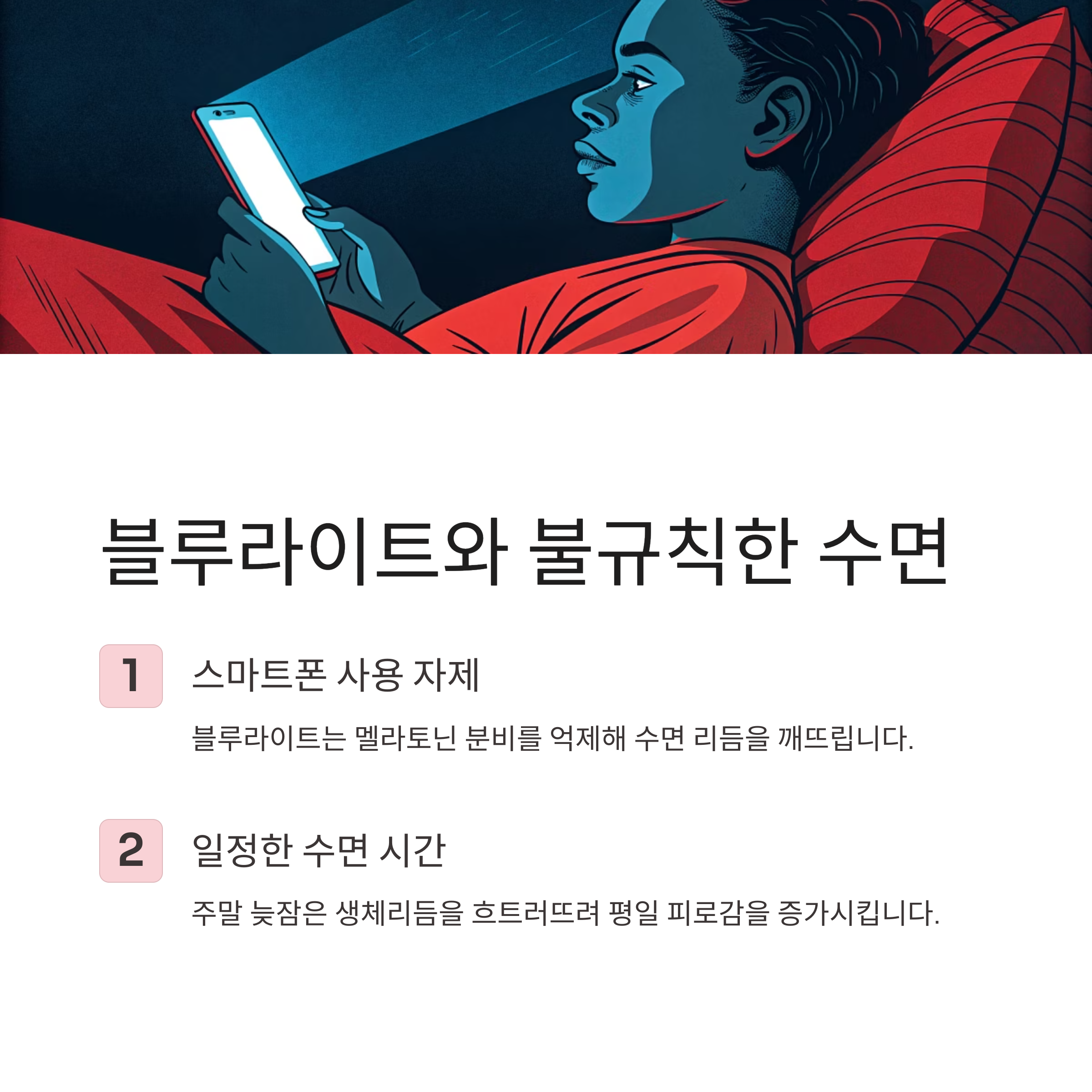 블루라이트가 수면 호르몬 멜라토닌 분비를 억제하여 잠들기 어렵게 만듭니다.