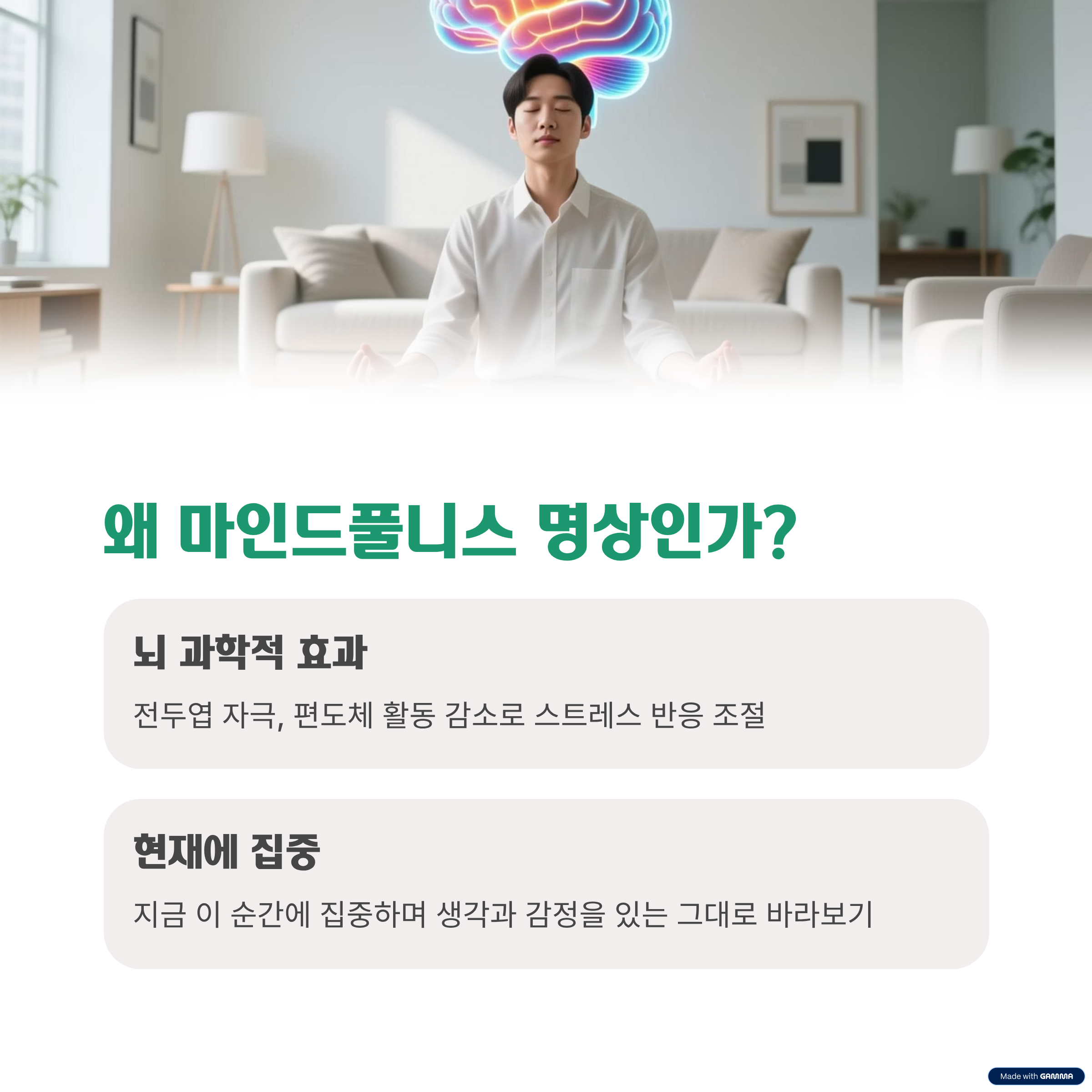 마인드풀니스 명상이란 '지금 이 순간'에 집중하는 명상법으로, 우리의 생각과 감정을 있는 그대로 바라보는 연습입니다. 특히 스트레스를 다스리는 데 매우 효과적인 방법으로 알려져 있는데요. 뇌 과학적으로도 마인드풀니스 명상은 전두엽을 자극하고, 스트레스 반응을 조절하는 편도체의 활동을 줄여준다고 해요. 쉽게 말해, 자극적인 환경 속에서도 마음을 차분하게 유지하도록 도와주는 거죠.