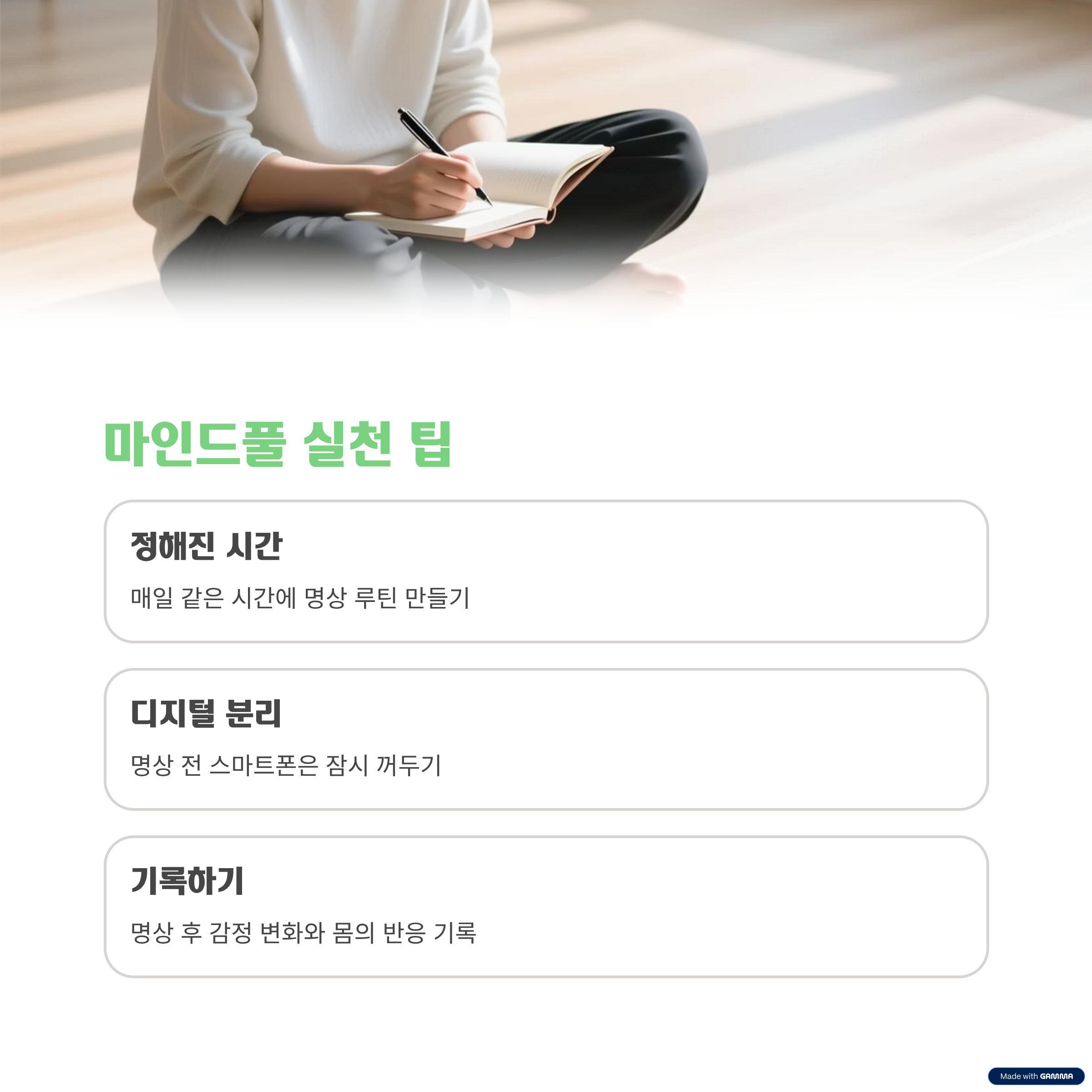 명상도 습관입니다. 일상 속에서 꾸준히 실천하는 것이 가장 중요해요. 아래는 제가 직접 실천하고 효과를 본 마인드풀 명상 루틴 팁들이에요.