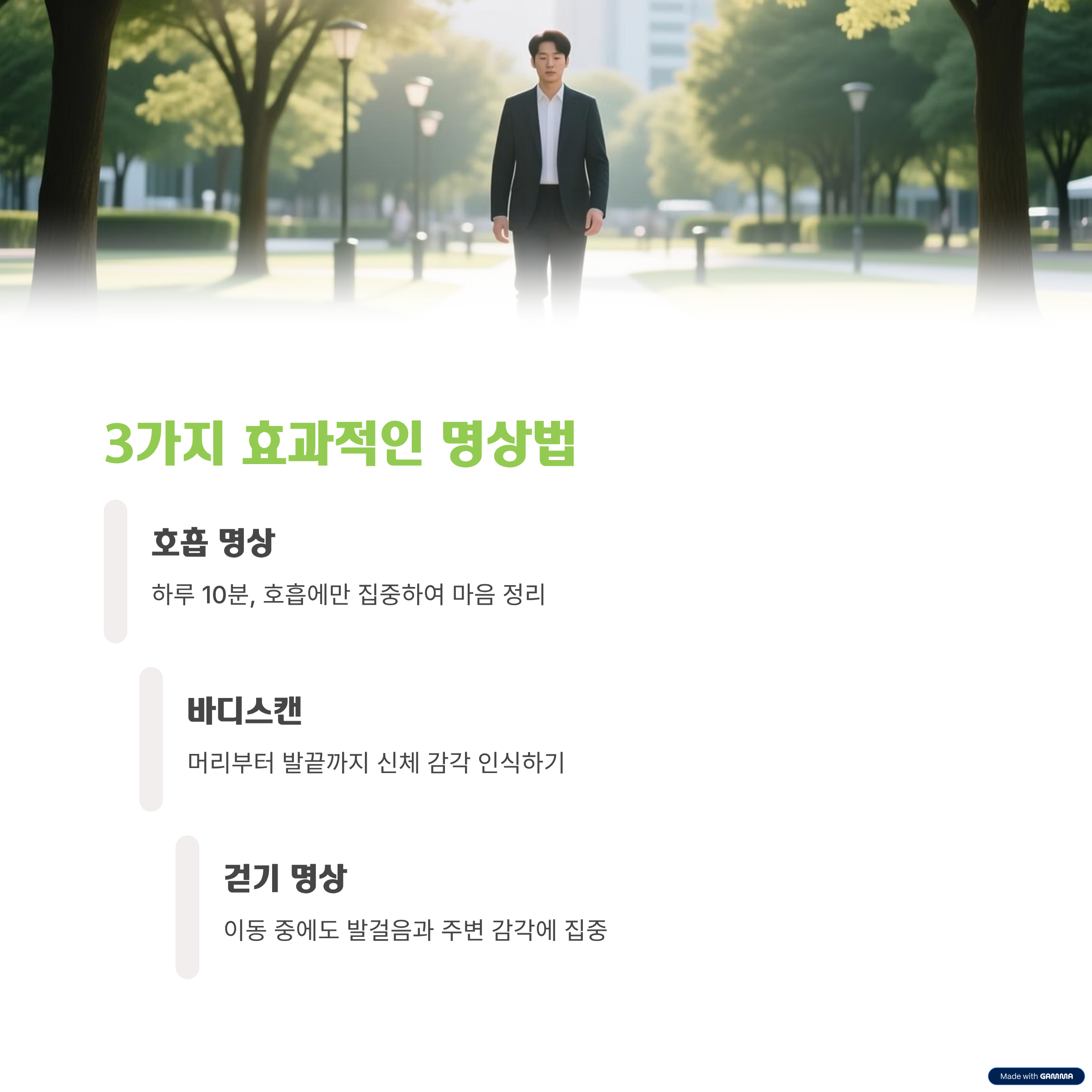 가장 기본적이면서도 강력한 마인드풀니스 명상은 ‘호흡 명상’입니다. 하루에 단 10분만 투자해도 스트레스가 한결 가벼워질 수 있어요. 방법은 간단합니다. 조용한 장소에 앉아 눈을 감고, 자신의 호흡에만 집중하는 것이죠. 숨을 들이쉬고, 내쉬는 그 리듬에만 신경을 써보세요.