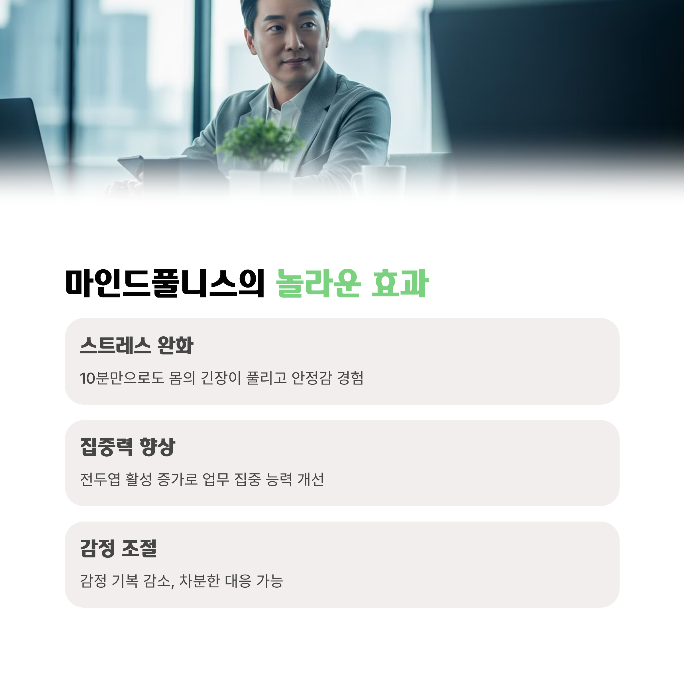 - 스트레스 완화 : 명상 10분만으로도 몸의 긴장이 풀리며 안정감을 경험할 수 있습니다.