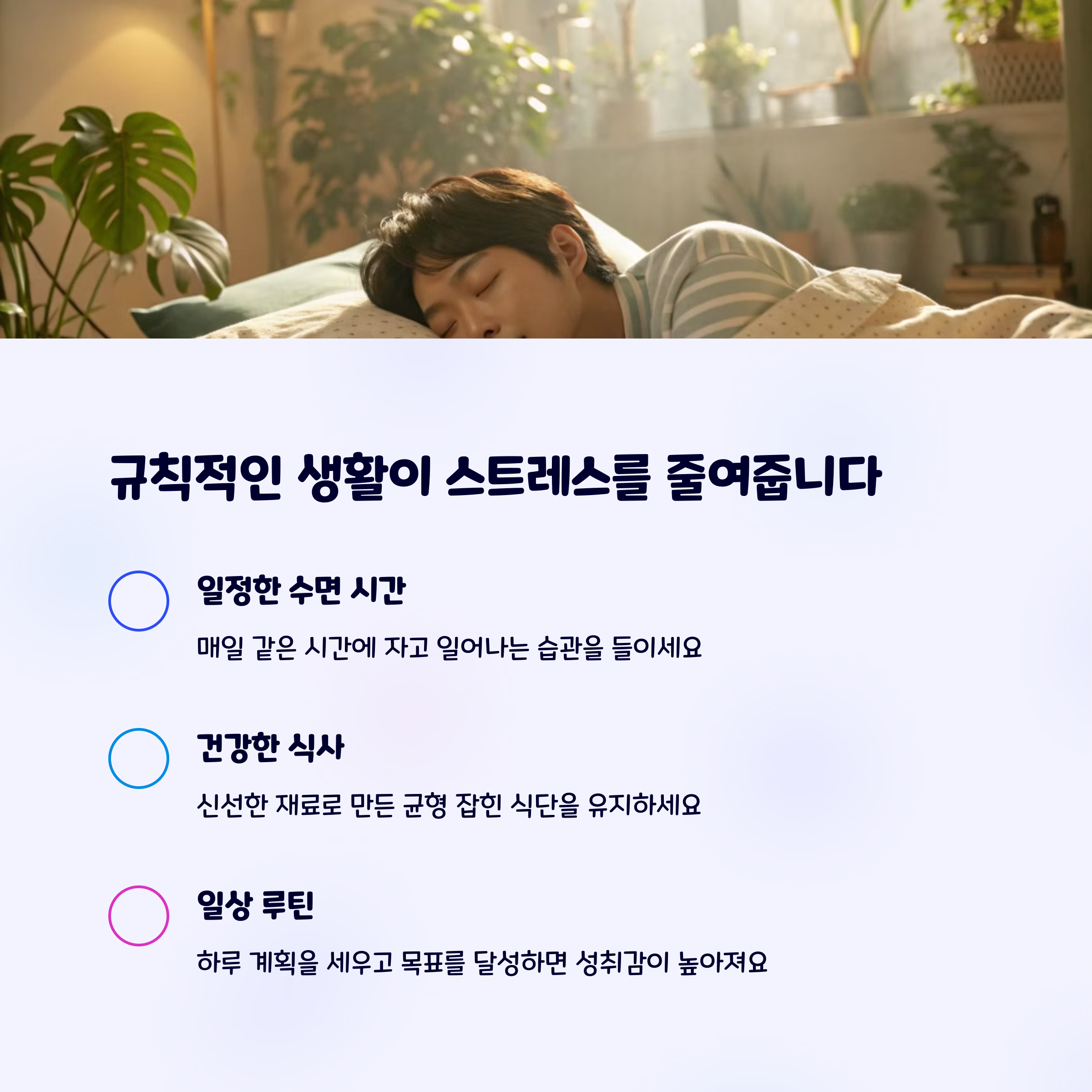 규칙적인 생활 습관은 스트레스 완화에 매우 효과적입니다. 수면, 식사, 운동을 일정한 루틴으로 유지하면 우리 몸은 안정감을 느끼게 되고, 외부 자극에 더 유연하게 대응할 수 있습니다. 특히 하루 30분의 가벼운 유산소 운동은 뇌 내에서 행복 호르몬이라 불리는 세로토닌과 도파민의 분비를 촉진시켜 기분 전환에 큰 도움을 줍니다. 실제 많은 전문가들은 ‘꾸준한 걷기’만으로도 정신적 피로가 상당히 줄어들 수 있다고 강조합니다.