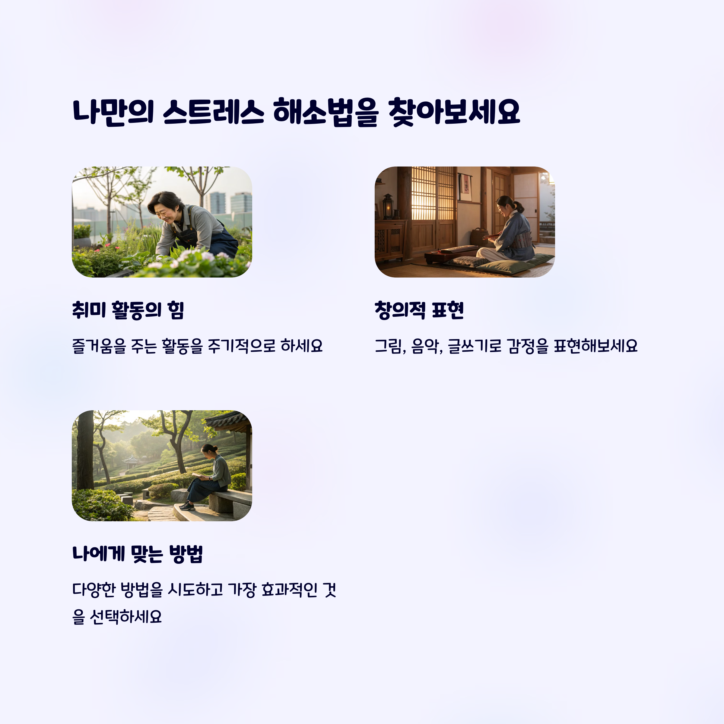 마지막으로, 자신만의 스트레스 해소법을 찾는 것이 무엇보다 중요합니다. 명상, 요가, 뜨개질, 글쓰기 등 자신에게 맞는 활동은 스트레스 상황을 빠르게 이완시키는 데 효과적입니다. 무엇이든 ‘나를 위한 시간’이라는 인식이 동반되면 그 행위는 치료적인 힘을 갖게 됩니다. 또한 평소 감사하는 습관을 기르는 것도 긍정적인 정서 형성에 큰 도움이 됩니다. 일상의 소소한 순간들에서 기쁨을 찾는 연습을 꾸준히 하며, 삶의 균형을 유지해 보세요.