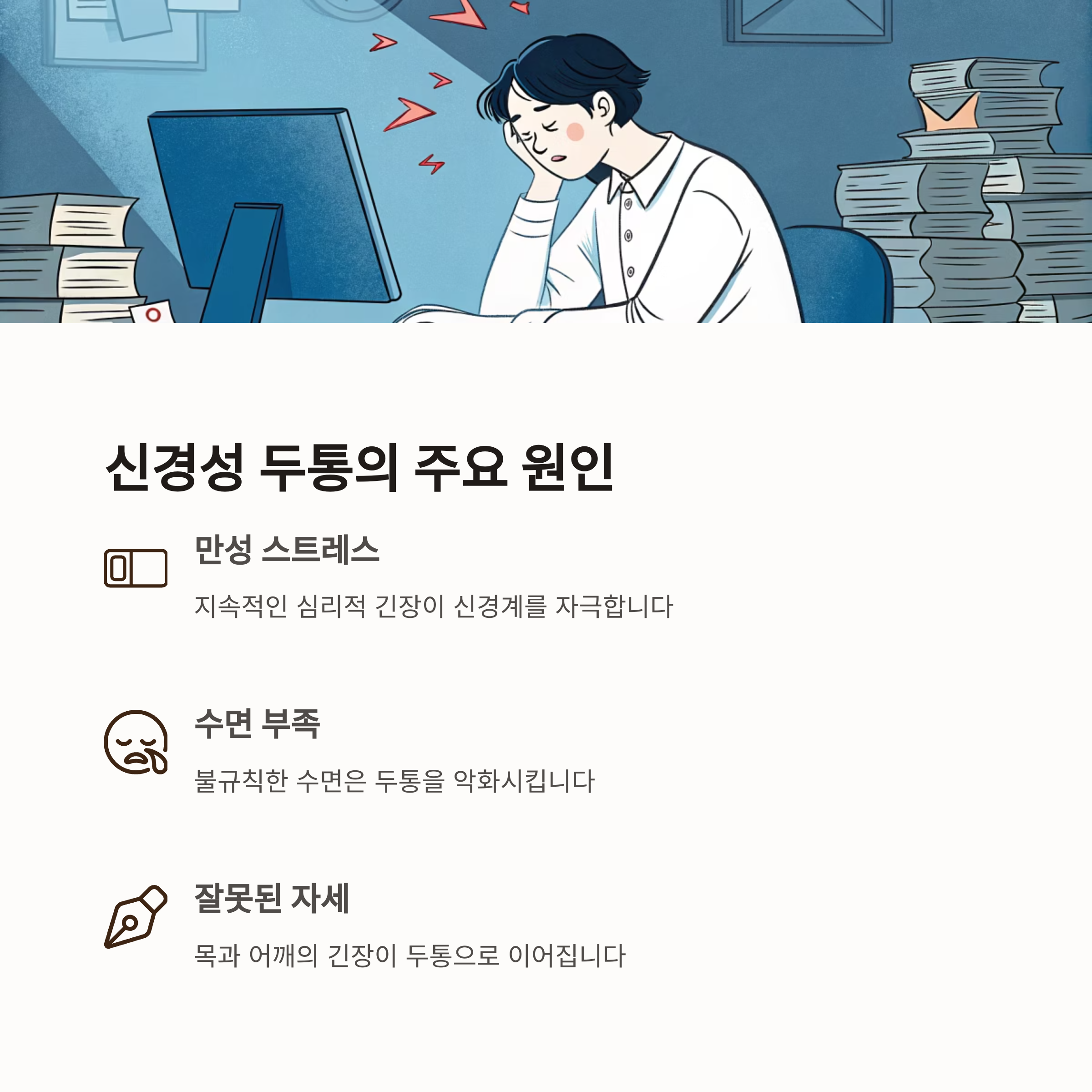| 만성 스트레스 | 신경계를 과도하게 자극하여 근육 긴장을 유발하고 두통으로 연결됩니다. |