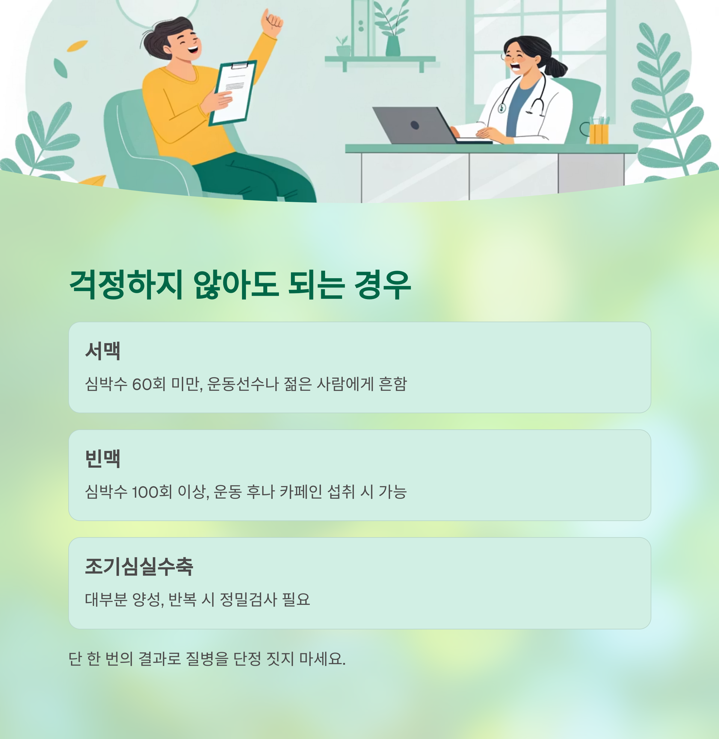 핵심: 한 번의 이상 결과만으로 진단하지 않으며, 반복 검사나 24시간 심전도 모니터가 필요한 경우도 많습니다.