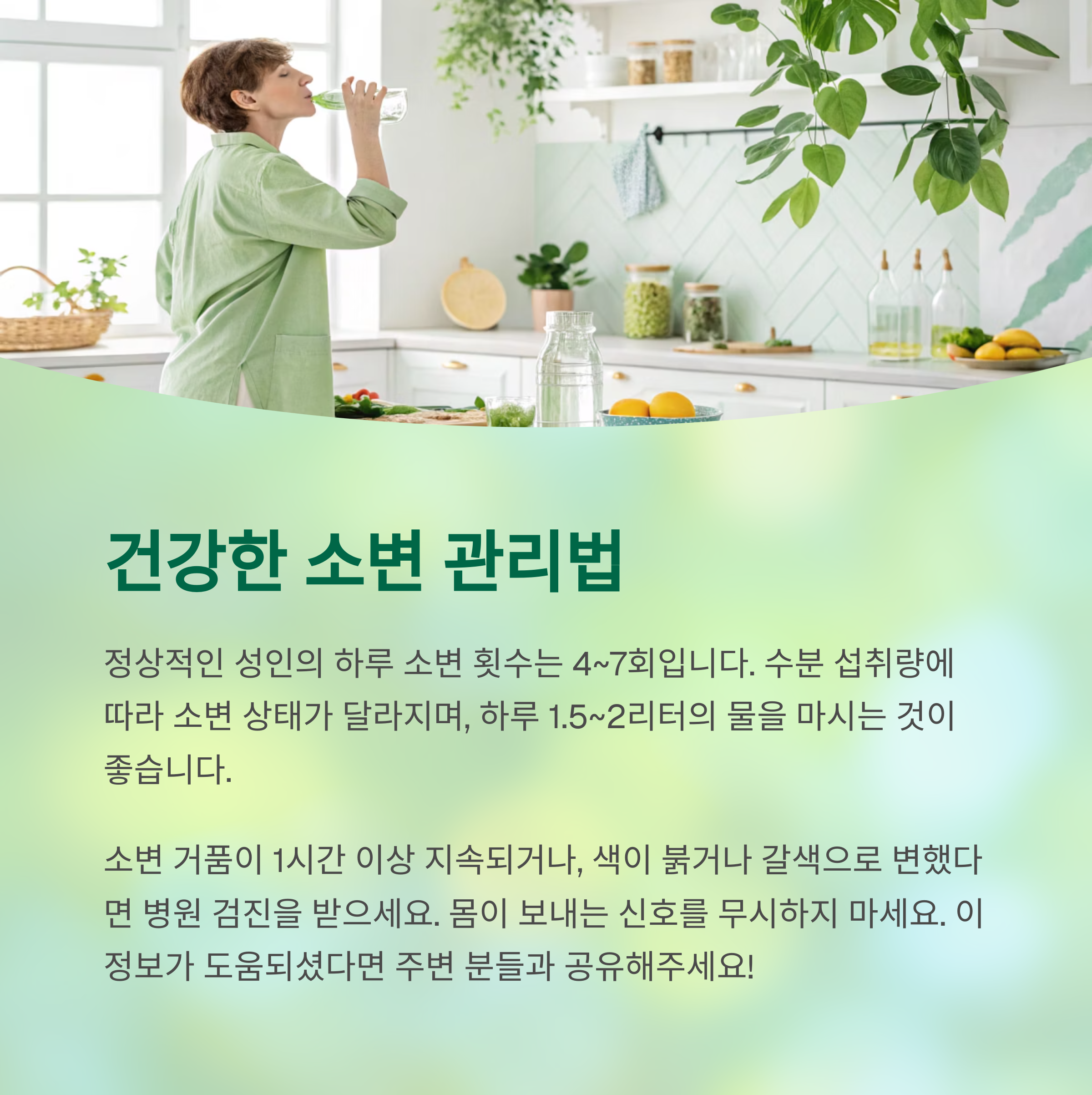 소변은 말없이 우리 몸의 상태를 가장 빠르게 알려주는 자연스러운 신호입니다. 아침 소변의 거품, 하루 소변 횟수, 색깔, 냄새 같은 작은 변화도 건강의 큰 단서를 제공하죠. 이번 글을 통해 스스로 소변 상태를 체크하고, 이상이 있다면 병원을 방문하는 습관을 들이셨으면 좋겠습니다. 몸이 보내는 신호를 무시하지 마세요. 건강은 작은 관심에서 시작됩니다.