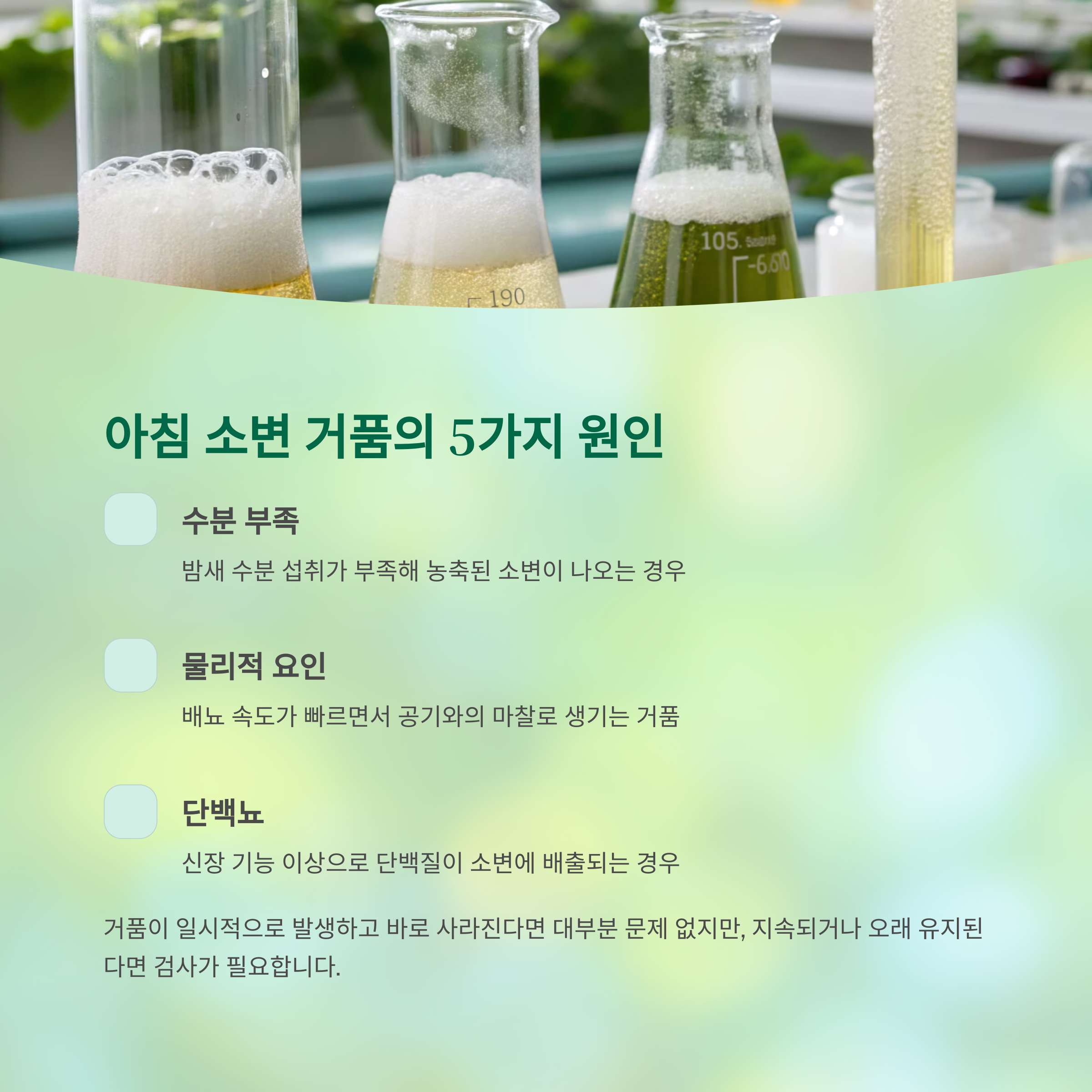 거품이 일시적으로 발생하고 바로 사라진다면 대부분 문제 없는 경우지만, 지속되거나 거품이 오래 유지된다면 정확한 검사와 진단이 필요합니다.