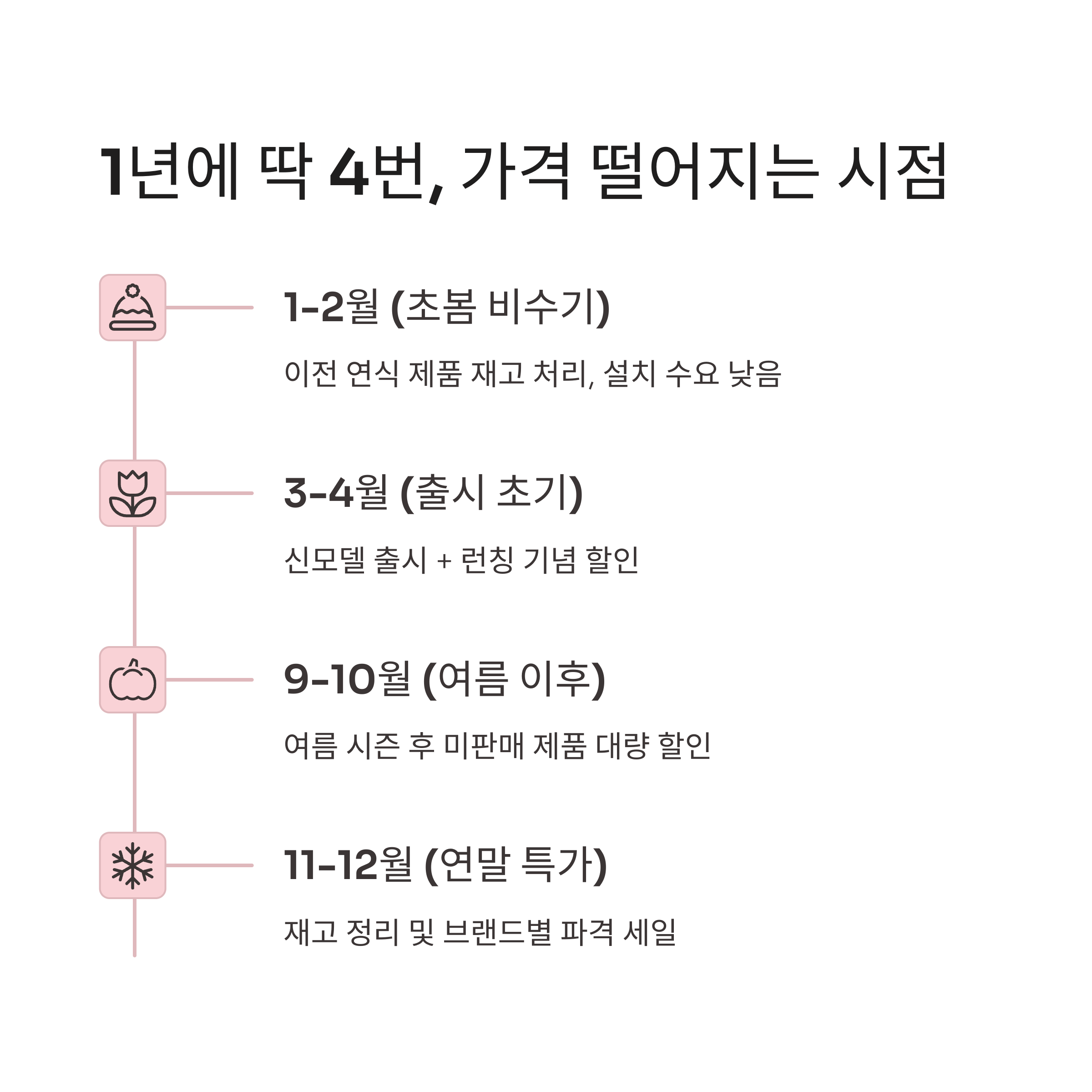 | 1월~2월 (초봄 비수기) | 이전 연식 제품 재고 처리, 설치 수요 낮음 |