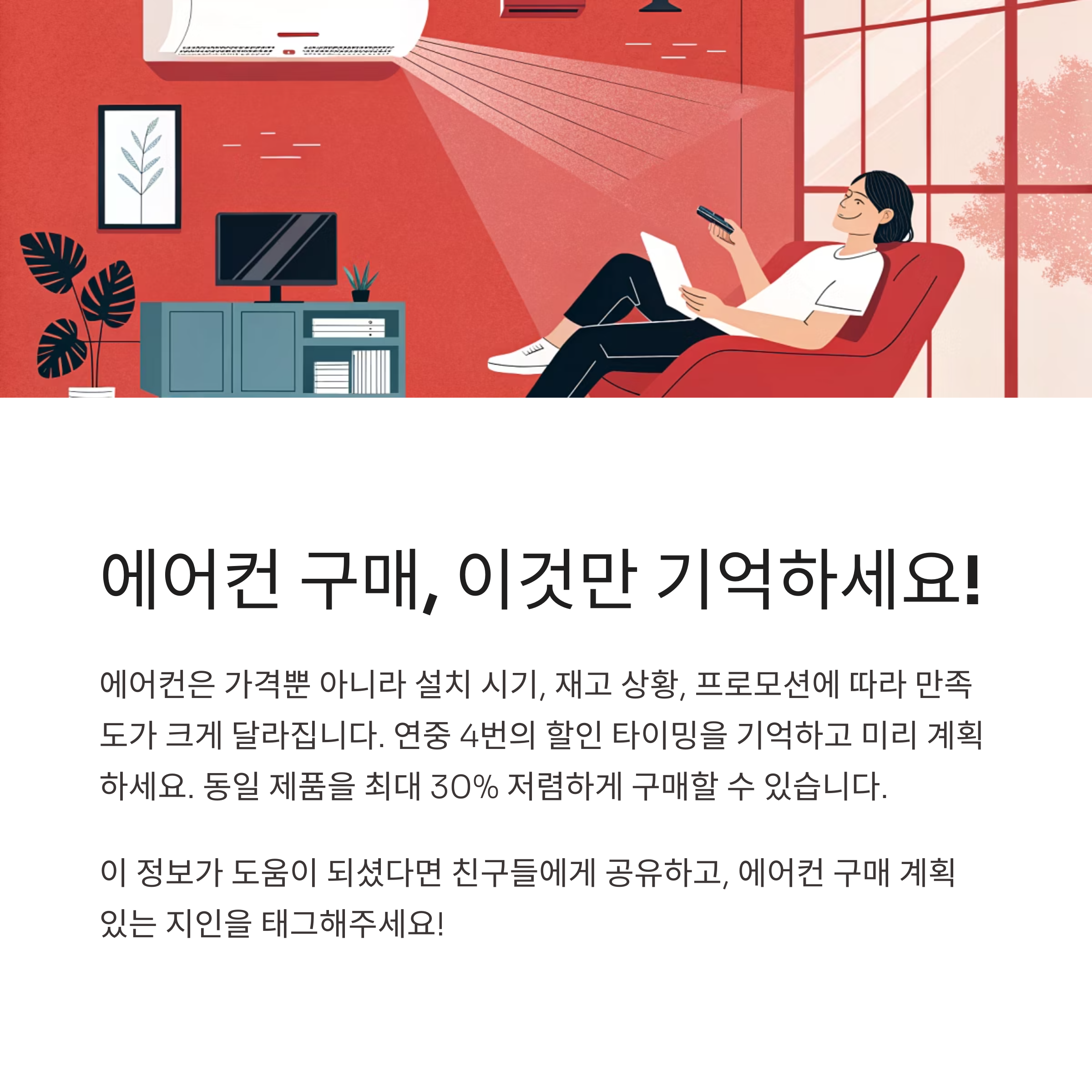 에어컨은 가격도 가격이지만, 설치 시기나 재고 상황, 프로모션 유무에 따라 구매 만족도가 천차만별로 갈립니다. 오늘 소개해드린 연중 4번의 타이밍만 잘 기억하셔도, 동일한 제품을 훨씬 저렴하게, 더 빠르게 설치하실 수 있어요. 여름 직전에 허겁지겁 사지 말고, 미리 계획해서 똑똑하게 쇼핑하세요! 여러분의 시원한 여름을 위해 이 글이 조금이나마 도움이 되었다면 좋겠습니다.