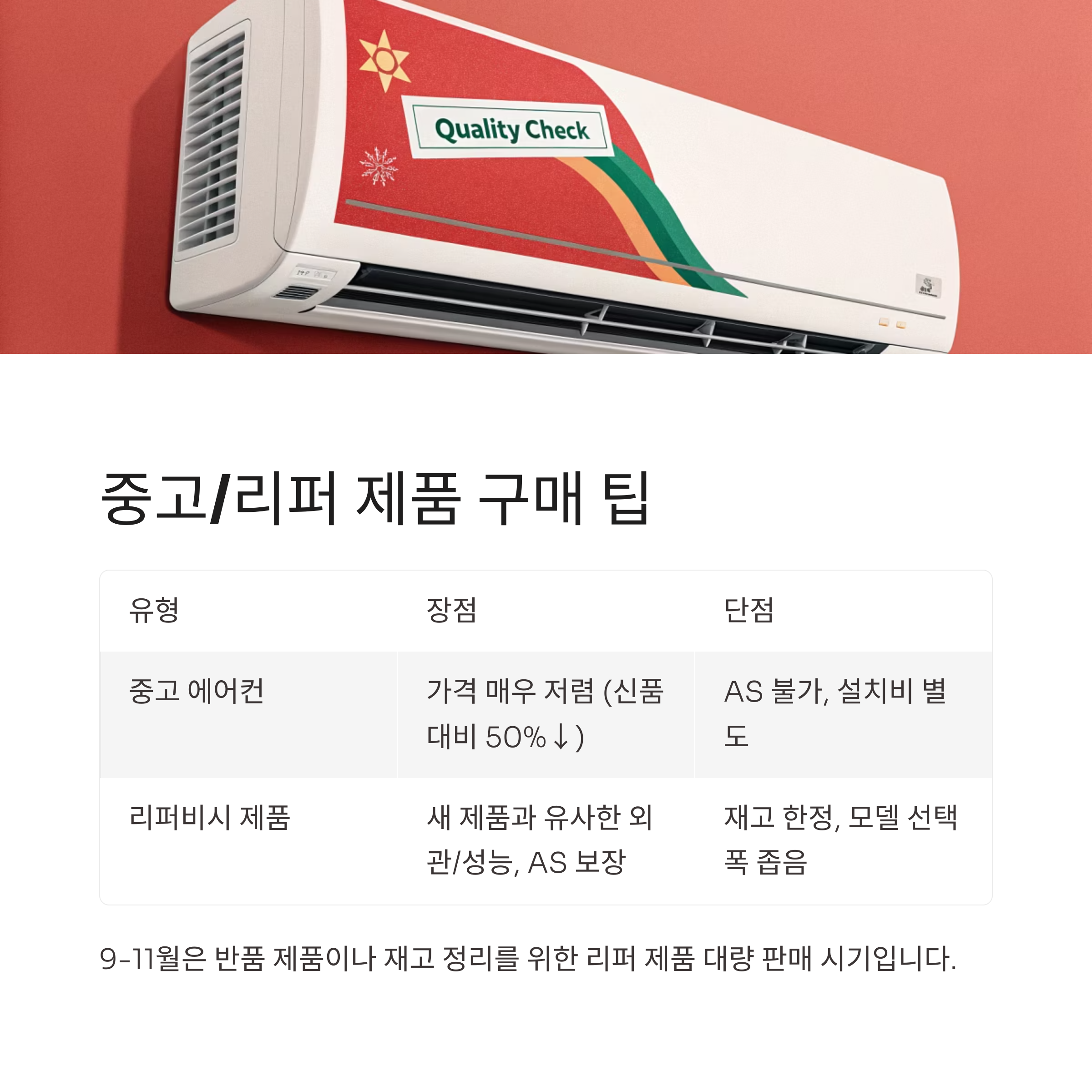 | 중고 에어컨 | 가격이 매우 저렴 (신품 대비 50%↓) | AS 불가, 설치비 별도 |