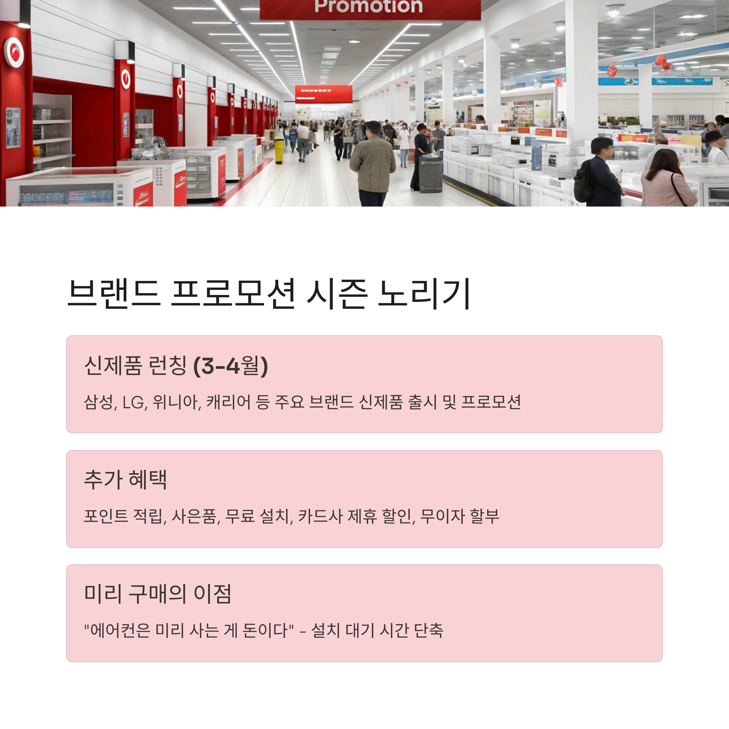 삼성, LG, 위니아, 캐리어 등 주요 브랜드들은 매년 3월~4월 사이에 신제품 런칭 프로모션을 진행합니다. 이 시기를 노리면 신제품임에도 불구하고 할인된 가격으로 구매할 수 있으며, 포인트 적립, 사은품 증정, 무료 설치 등 다양한 혜택을 누릴 수 있어요. 여기에 카드사 제휴 할인이나 무이자 할부가 함께 적용되면 체감 구매가는 더욱 낮아지게 됩니다. “에어컨은 미리 사는 게 돈이다”라는 말, 괜히 나온 게 아닙니다.