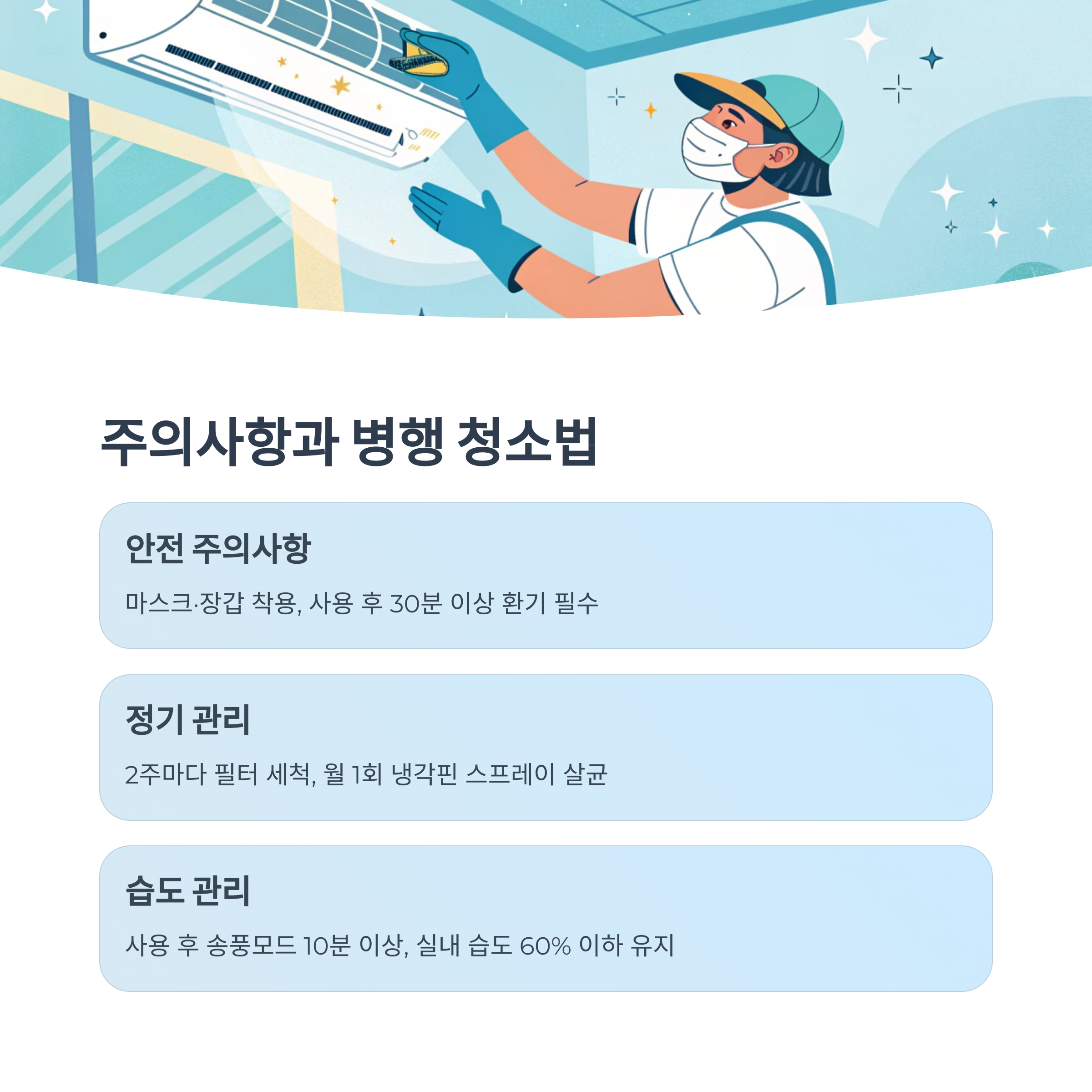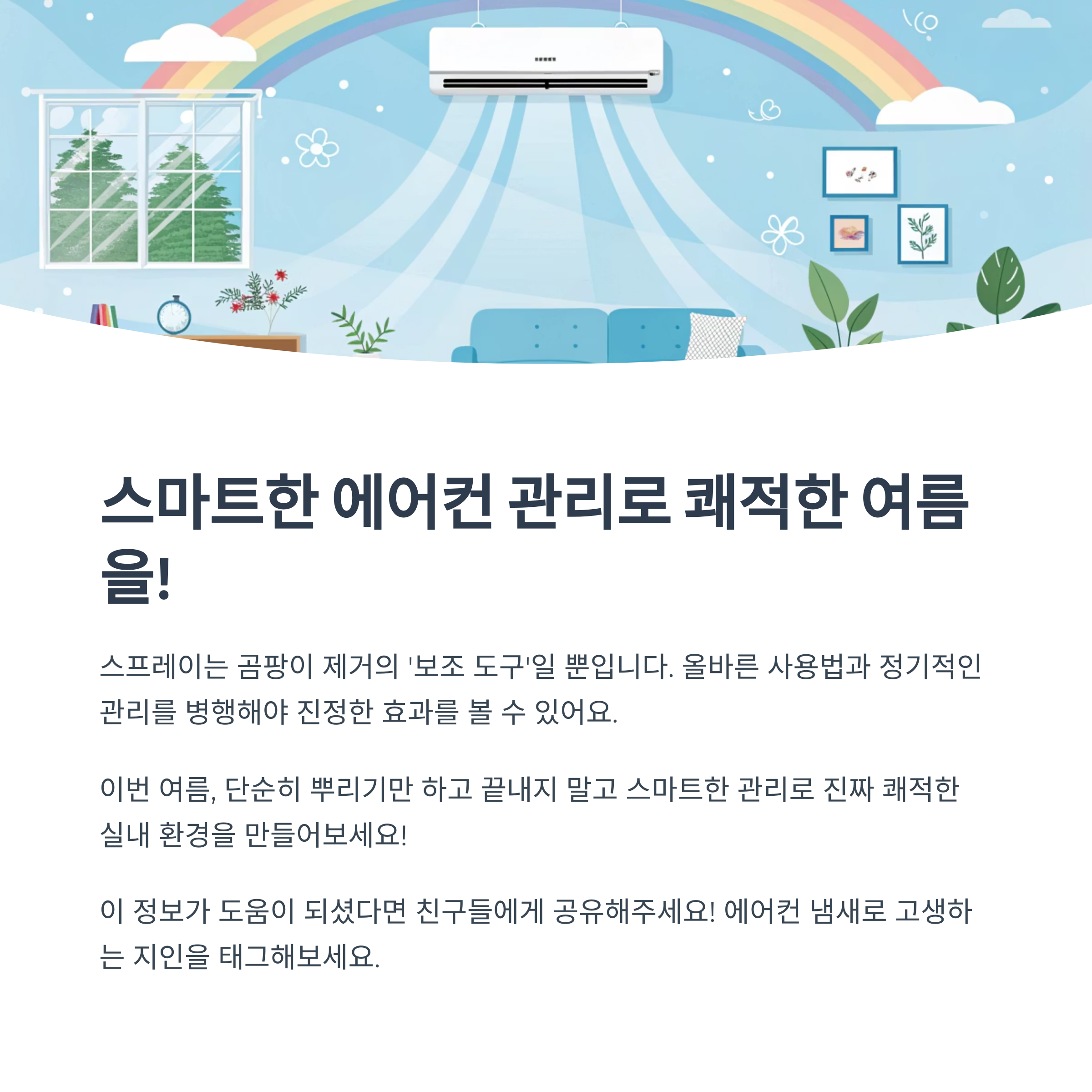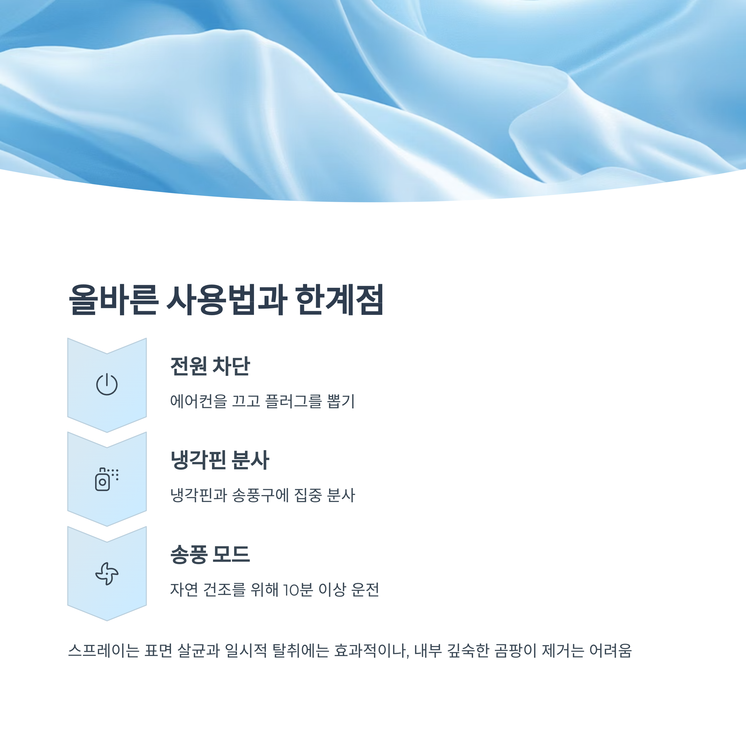 스프레이는 예방보다는 응급처치에 가깝습니다. 송풍모드 사용, 필터 청소, 실내 습도 관리 등과 함께 병행해야 예방 효과가 높습니다.