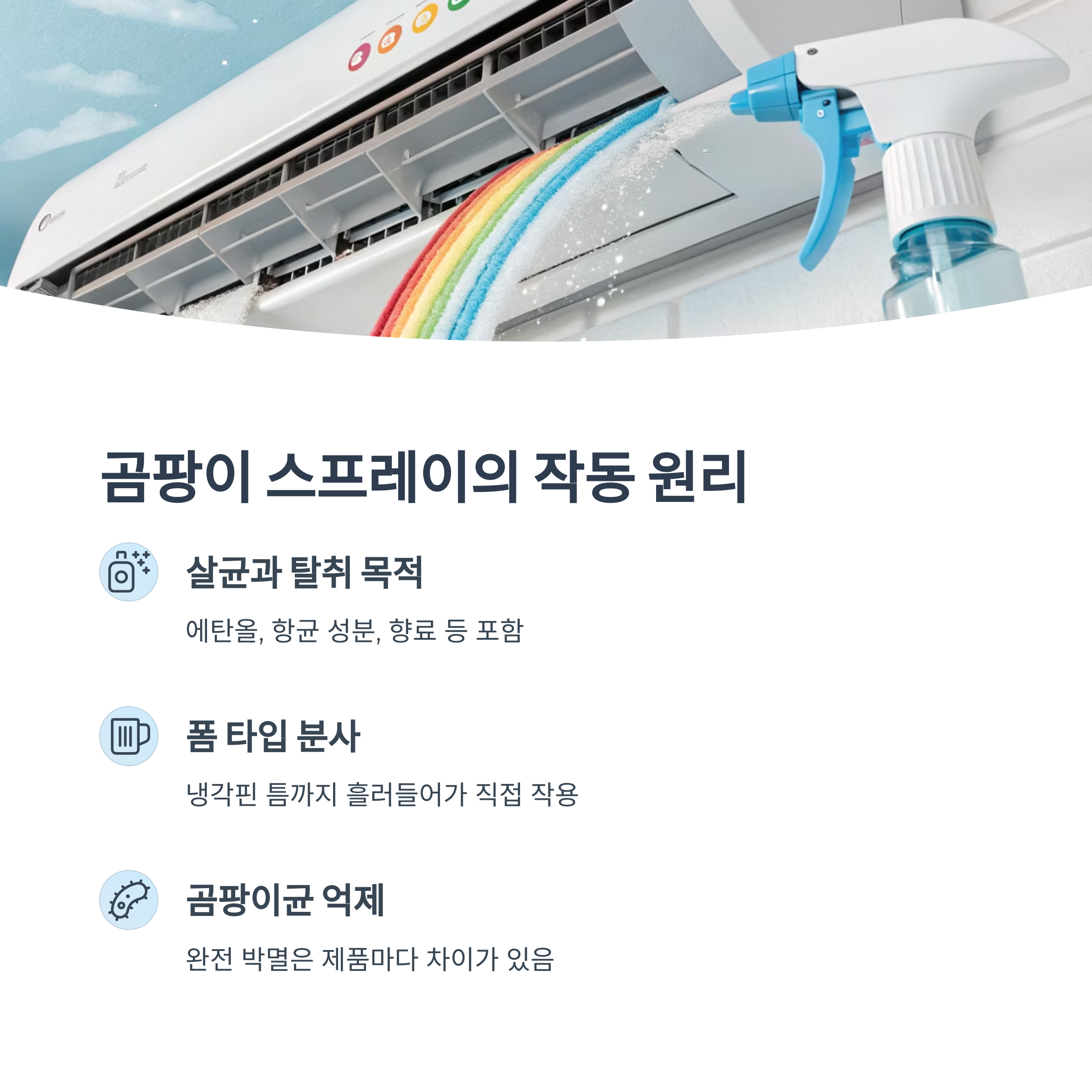 에어컨 곰팡이 제거 스프레이는 기본적으로 ‘살균’과 ‘탈취’를 목적으로 만들어진 제품입니다. 대부분 에탄올, 항균 성분, 향료 등을 포함하고 있어 곰팡이균의 번식을 억제하고, 일시적인 냄새 제거 효과를 제공합니다. 일부 제품은 폼 타입으로 분사되어 에어컨 내부의 틈까지 흘러 들어가 냉각핀에 직접 작용하기도 하죠. 하지만 곰팡이균을 완전히 ‘박멸’하는 것은 제품마다 큰 차이가 있습니다.