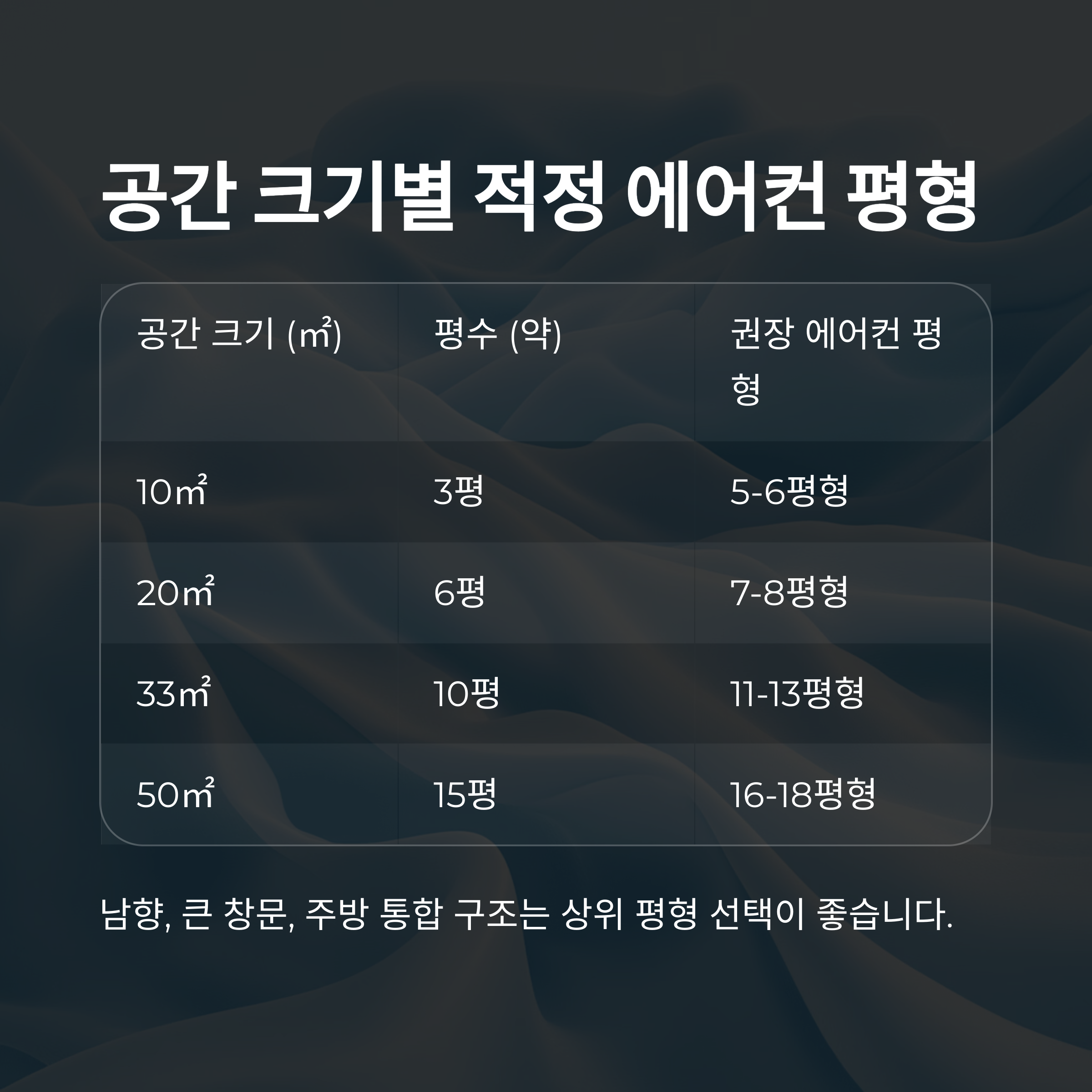 단열 상태가 나쁜 경우는 냉방 손실이 크기 때문에 실제 면적보다 1~2평 높은 평형을 선택하는 것이 안전합니다.