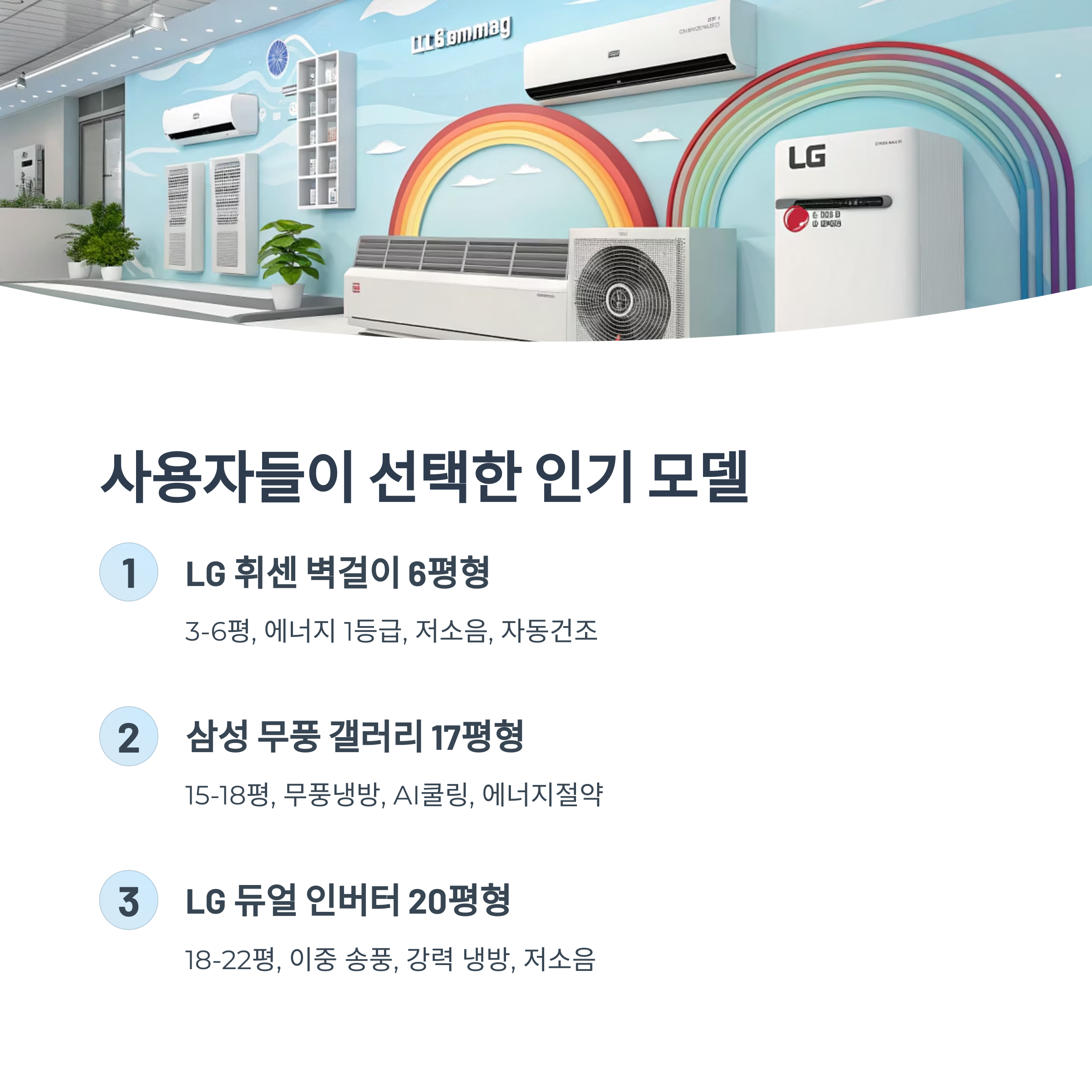 | LG 듀얼 인버터 20평형 | 18~22평 | 이중 송풍, 강력 냉방, 저소음 |