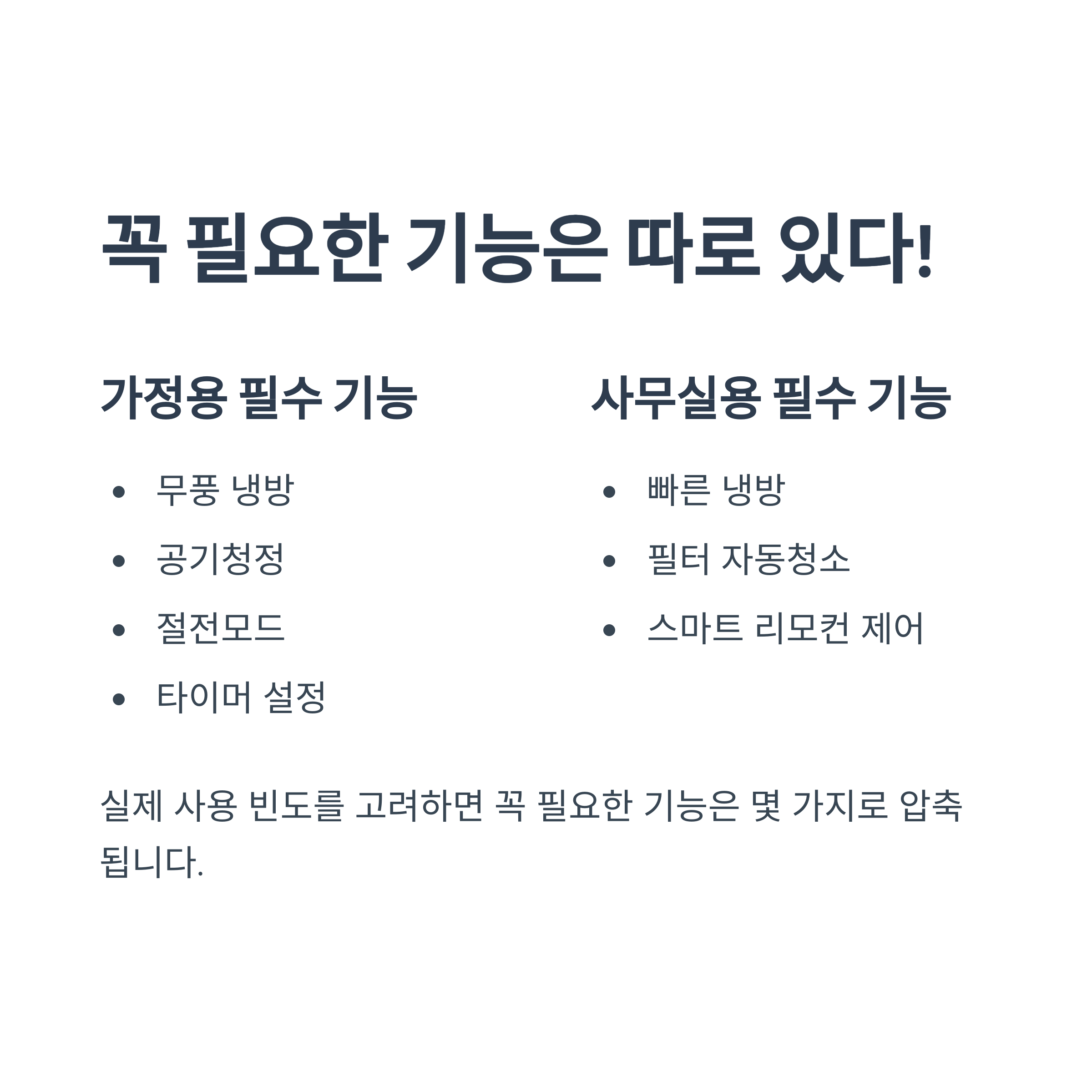 에어컨 기능이 다양해지면서 어떤 걸 써야 할지 고민되시죠? 실제 사용 빈도를 고려하면 꼭 필요한 기능은 몇 가지로 압축됩니다. 특히 가정용과 사무실용은 필요한 기능도 다릅니다.