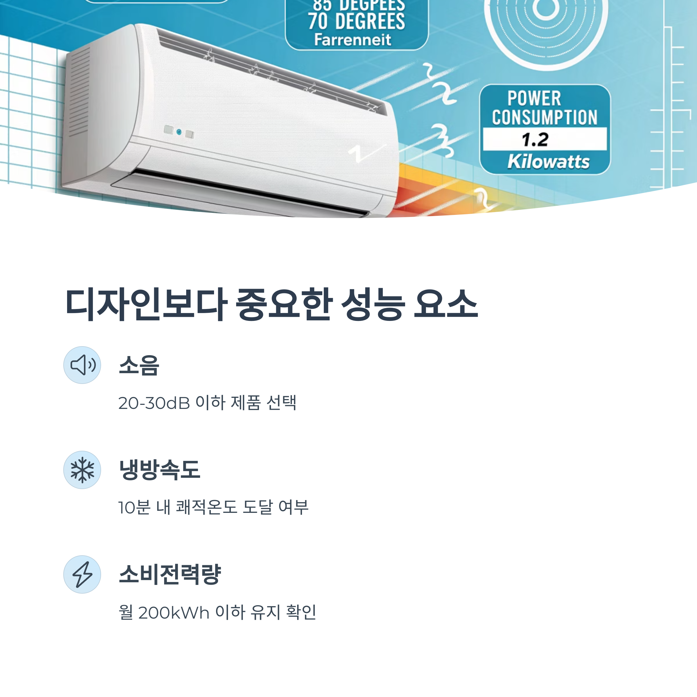 요즘 에어컨, 예쁜 게 많죠. 근데 성능이 따라주지 않으면 인테리어 소품에 불과해요. 실제로 소음, 냉방 속도, 전력 소비량 이 세 가지가 에어컨 선택에서 훨씬 더 중요하다는 거, 꼭 기억하세요.