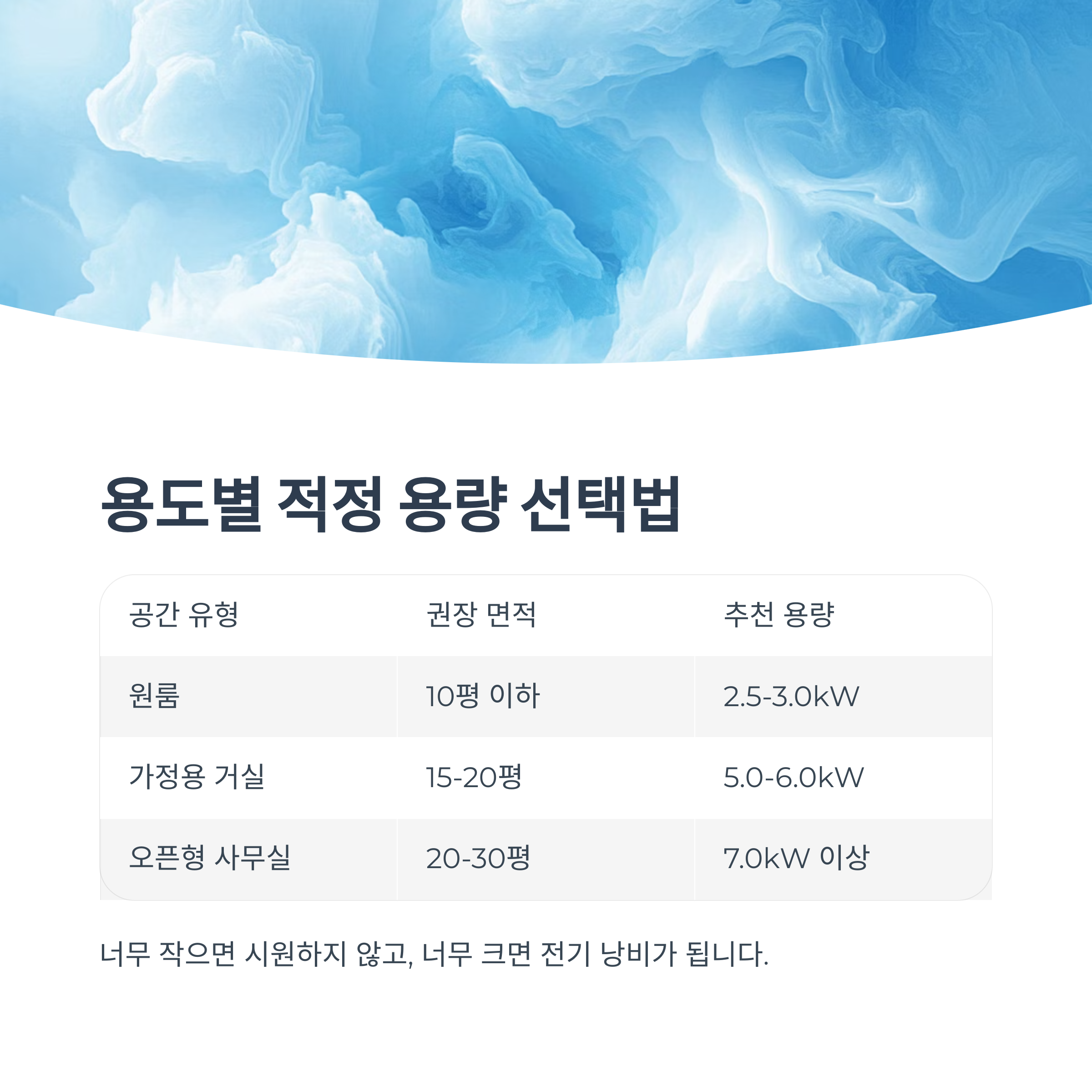 에어컨을 제대로 쓰려면 용량이 딱 맞아야 하죠. 너무 작으면 시원하지 않고, 너무 크면 전기 낭비예요. 일반적인 기준은 아래와 같습니다.