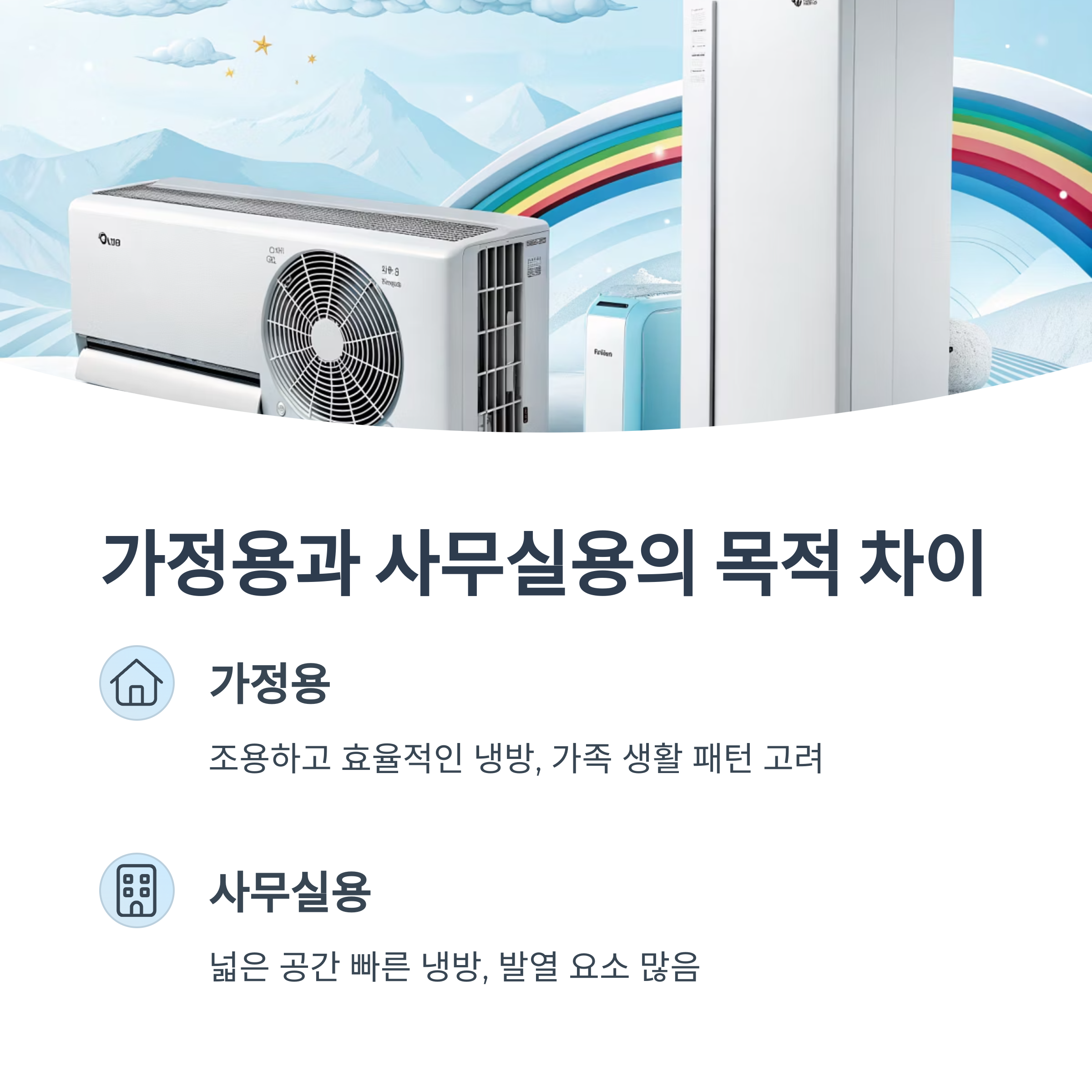 가정용은 조용함과 절전이 중요하고, 사무실용은 빠른 냉방과 넓은 공간 커버 능력이 중요합니다.