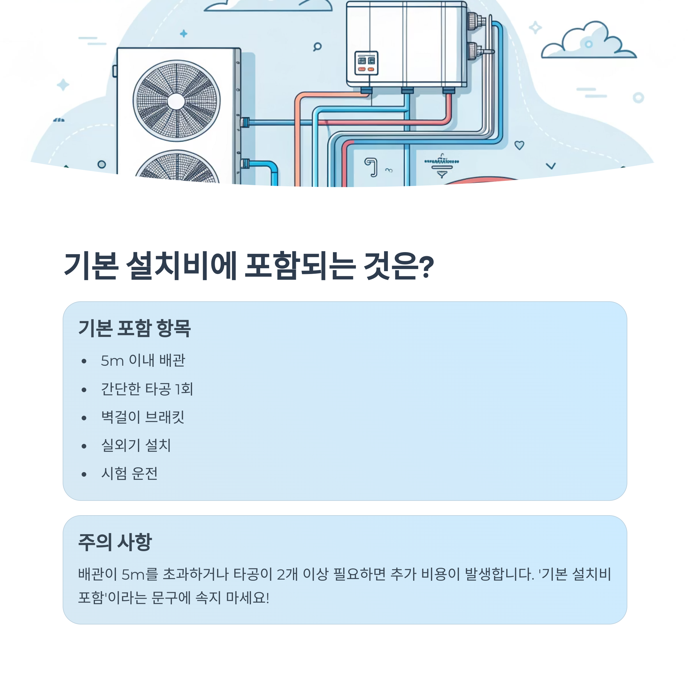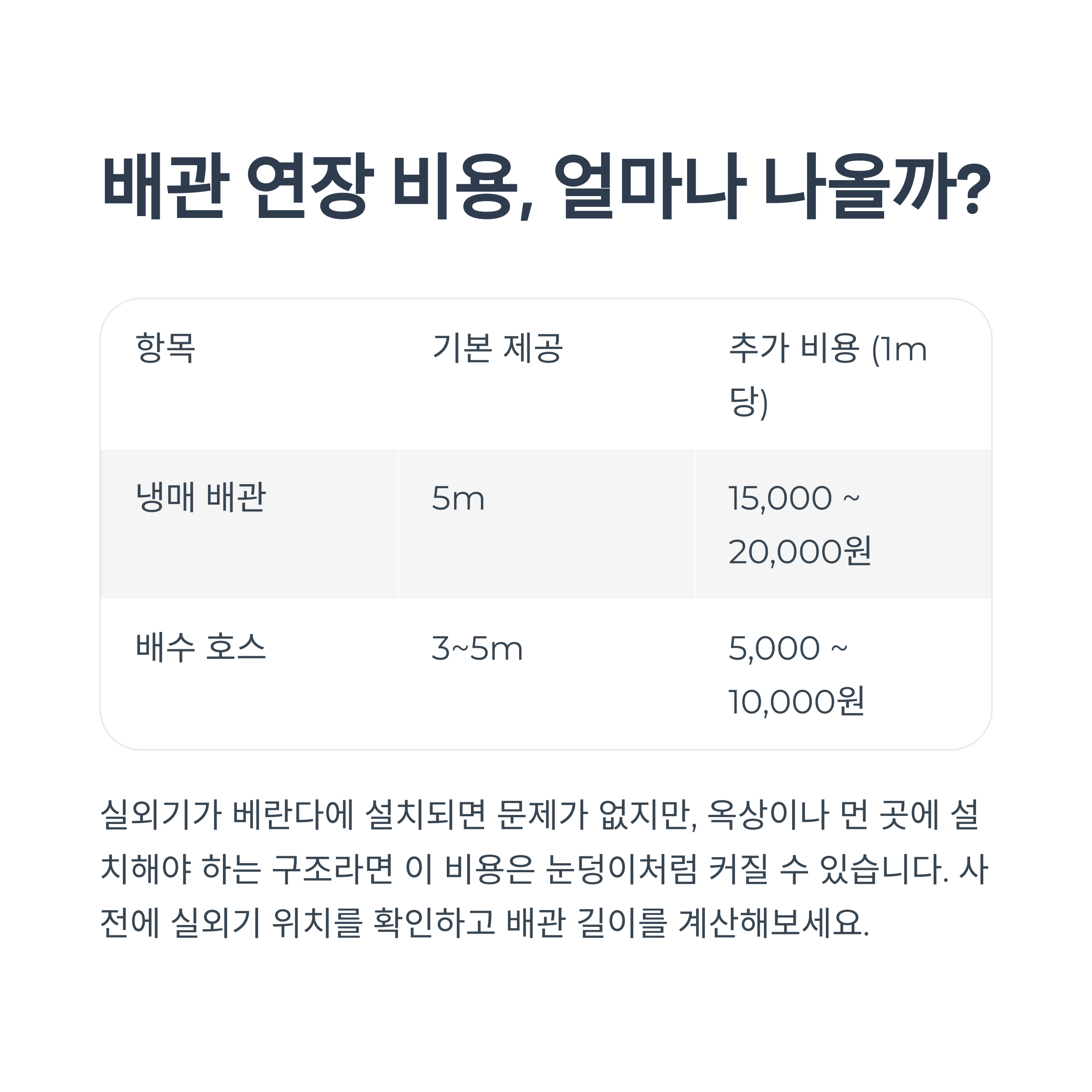 가장 자주 발생하는 추가 비용이 바로 배관 연장입니다. 기본 제공은 보통 5m이며, 이를 초과하는 경우 1m당 1만 5천 원~2만 원 정도의 추가 요금이 발생합니다. 실외기가 베란다에 설치되면 문제가 없지만, 옥상이나 먼 곳에 설치해야 하는 구조라면 이 비용은 눈덩이처럼 커질 수 있어요.