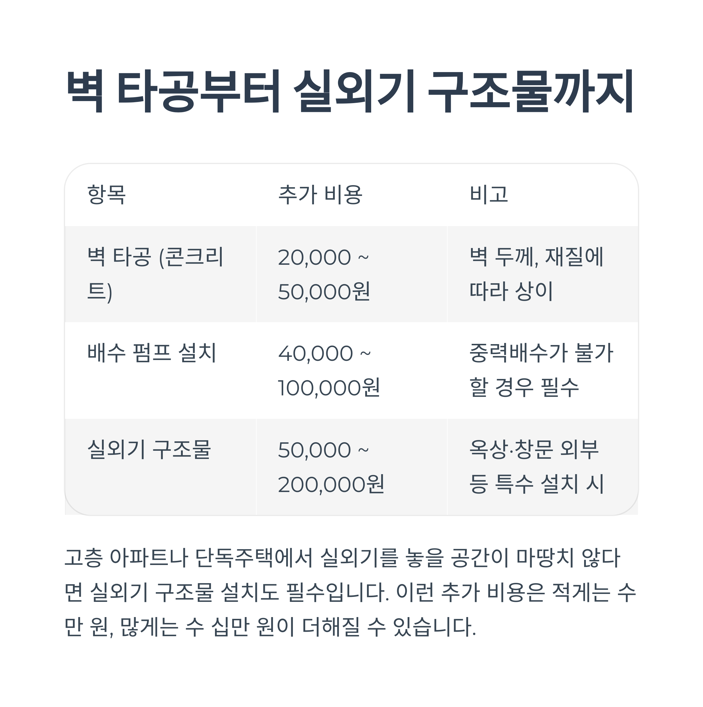 | 실외기 구조물 | 50,000 ~ 200,000원 | 옥상·창문 외부 등 특수 설치 시 |