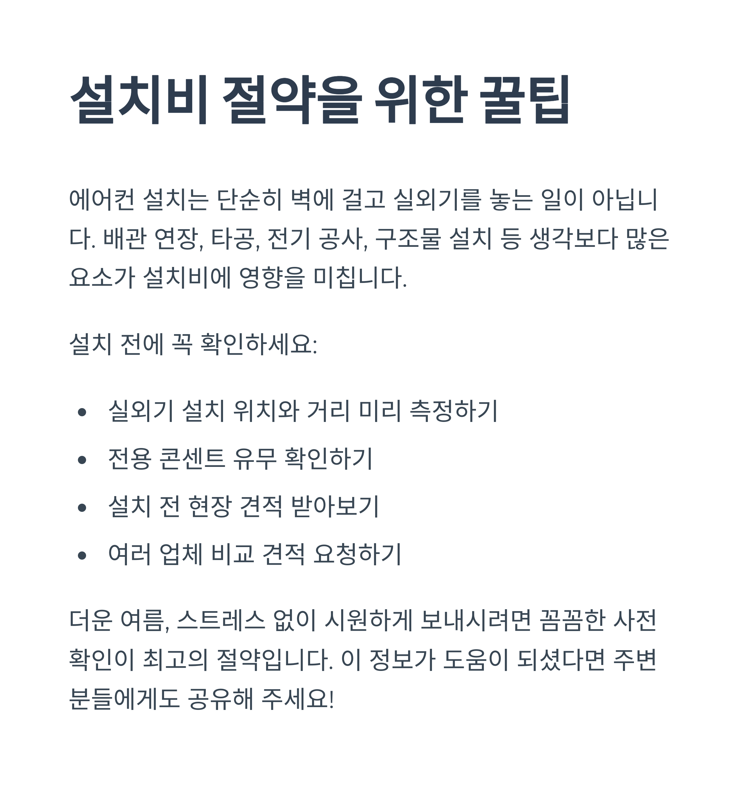 에어컨 설치는 단순히 벽에 걸고 실외기를 놓는 일이 아닙니다. 배관 연장, 타공, 전기 공사, 구조물 설치 등 생각보다 많은 요소가 설치비에 영향을 미치죠. 이 글을 통해 설치비의 구성 요소를 미리 알고 준비하신다면, 현장에서 갑작스럽게 추가 비용을 지불해야 하는 당황스러운 상황을 피할 수 있습니다. 더운 여름, 스트레스 없이 시원하게 보내시려면 꼼꼼한 사전 확인이 최고의 절약입니다. 여러분도 지금부터 설치 전에 꼭 체크해 보세요!
