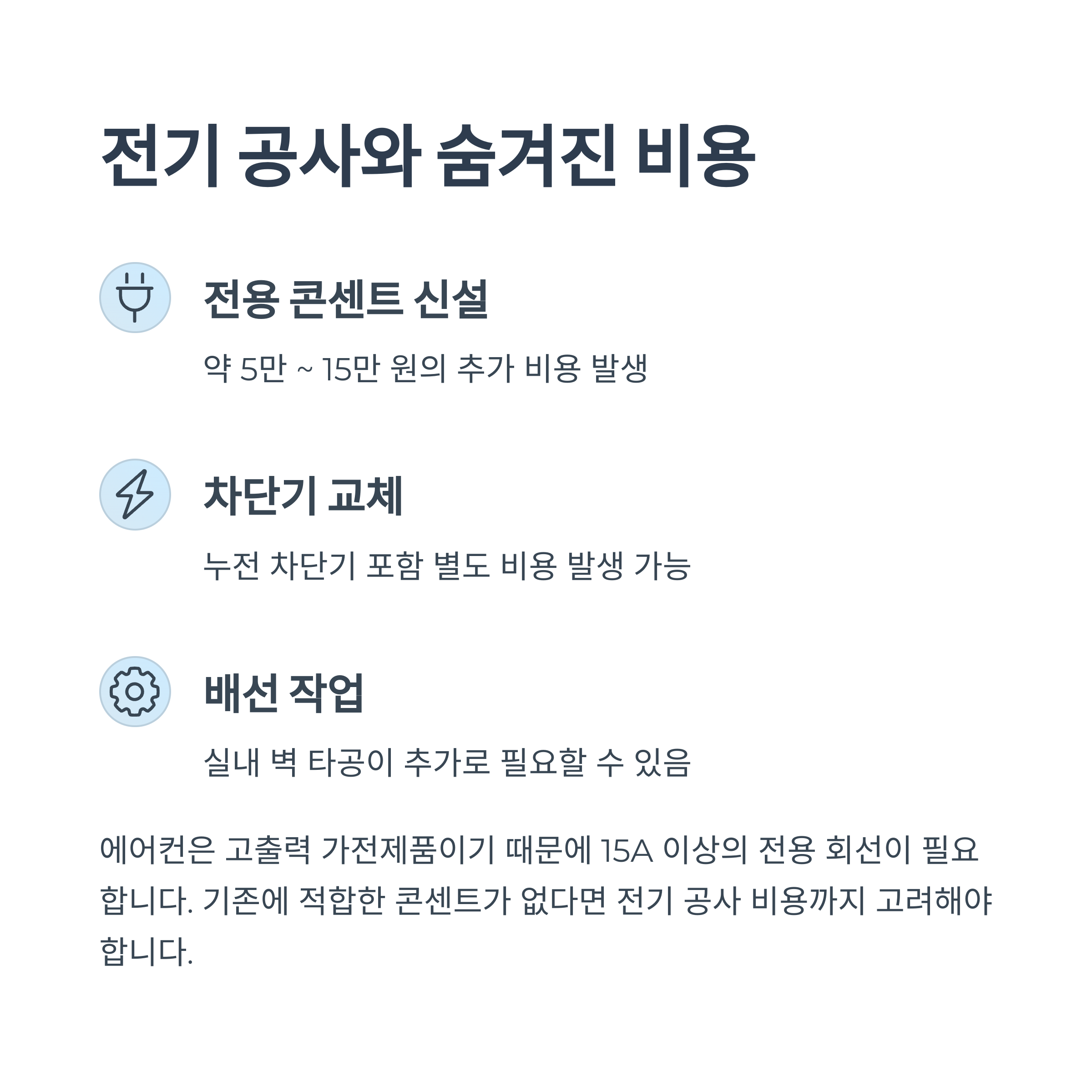 에어컨은 고출력 가전제품이기 때문에 15A 이상의 전용 회선을 필요로 합니다. 기존에 벽에 전용 콘센트가 없다면 전기 증설 공사가 필요하고, 이에 따라 별도의 비용이 발생합니다.