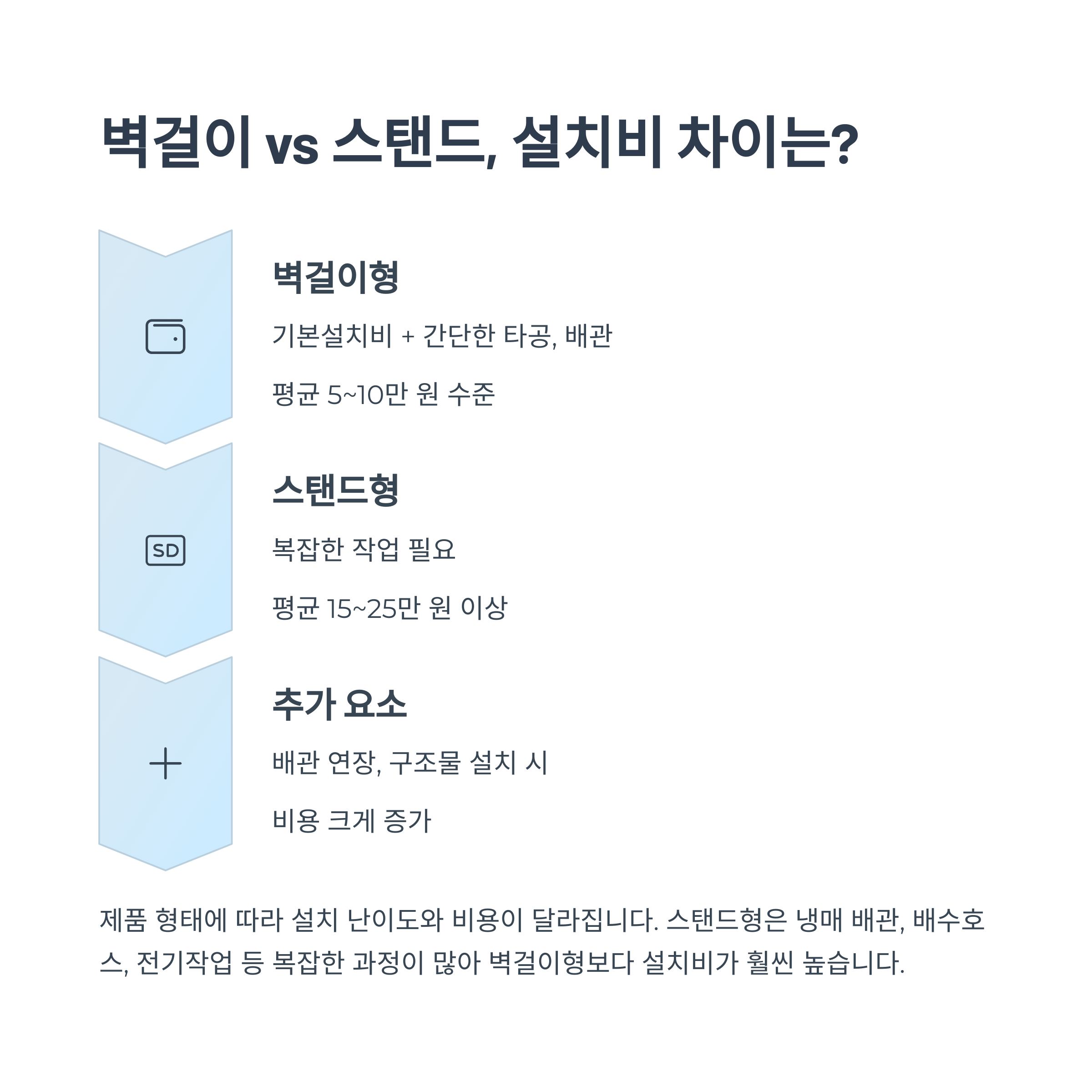 - 벽걸이형: 기본설치비 + 간단한 타공, 배관 → 저비용