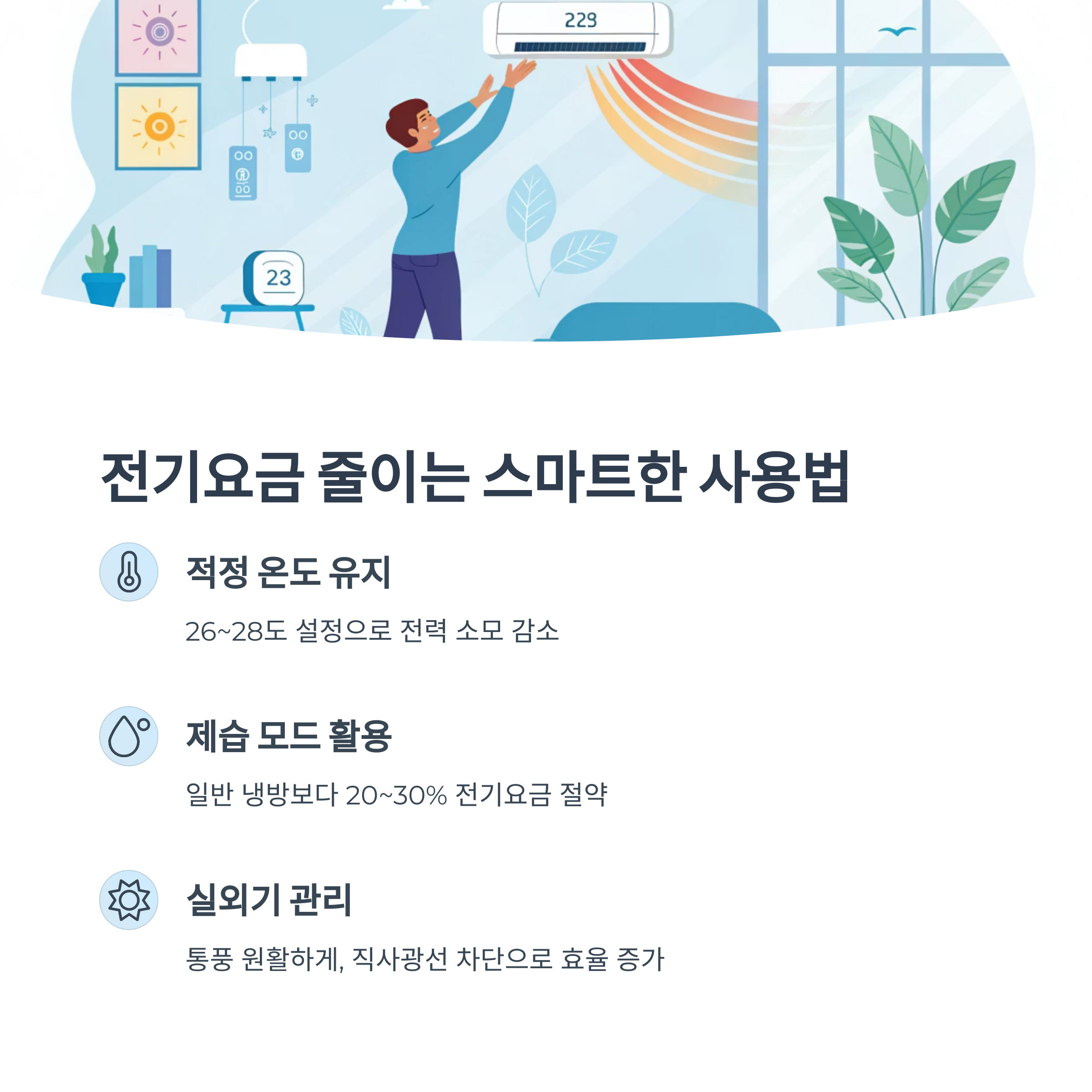 에어컨 사용을 줄이지 않고도 전기요금을 줄이는 방법은 생각보다 많습니다. 아래 팁들을 실천하면 효율적인 사용이 가능합니다.