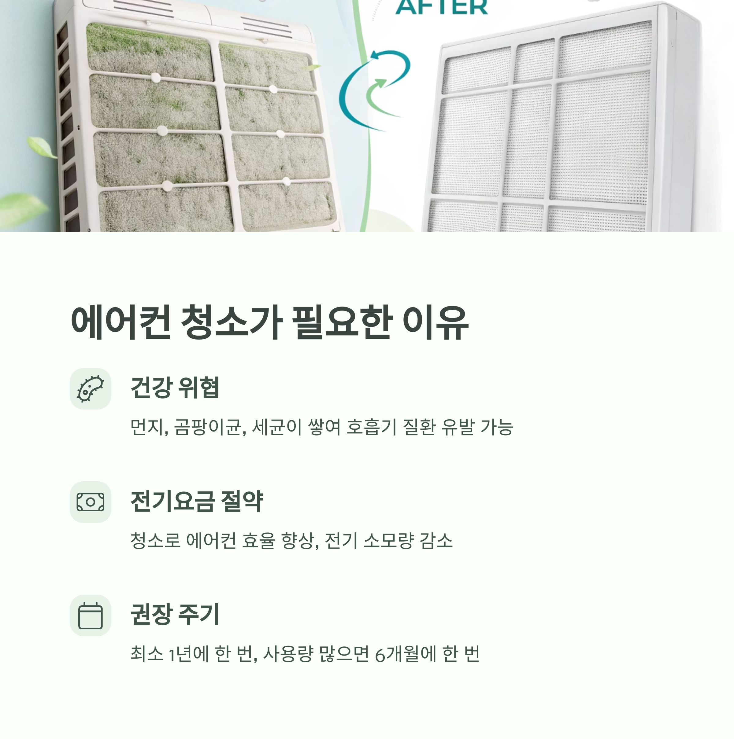 | 청소 범위 | 단순 필터 세척 vs 분해 청소, 곰팡이 제거, 항균 코팅 포함 여부 |