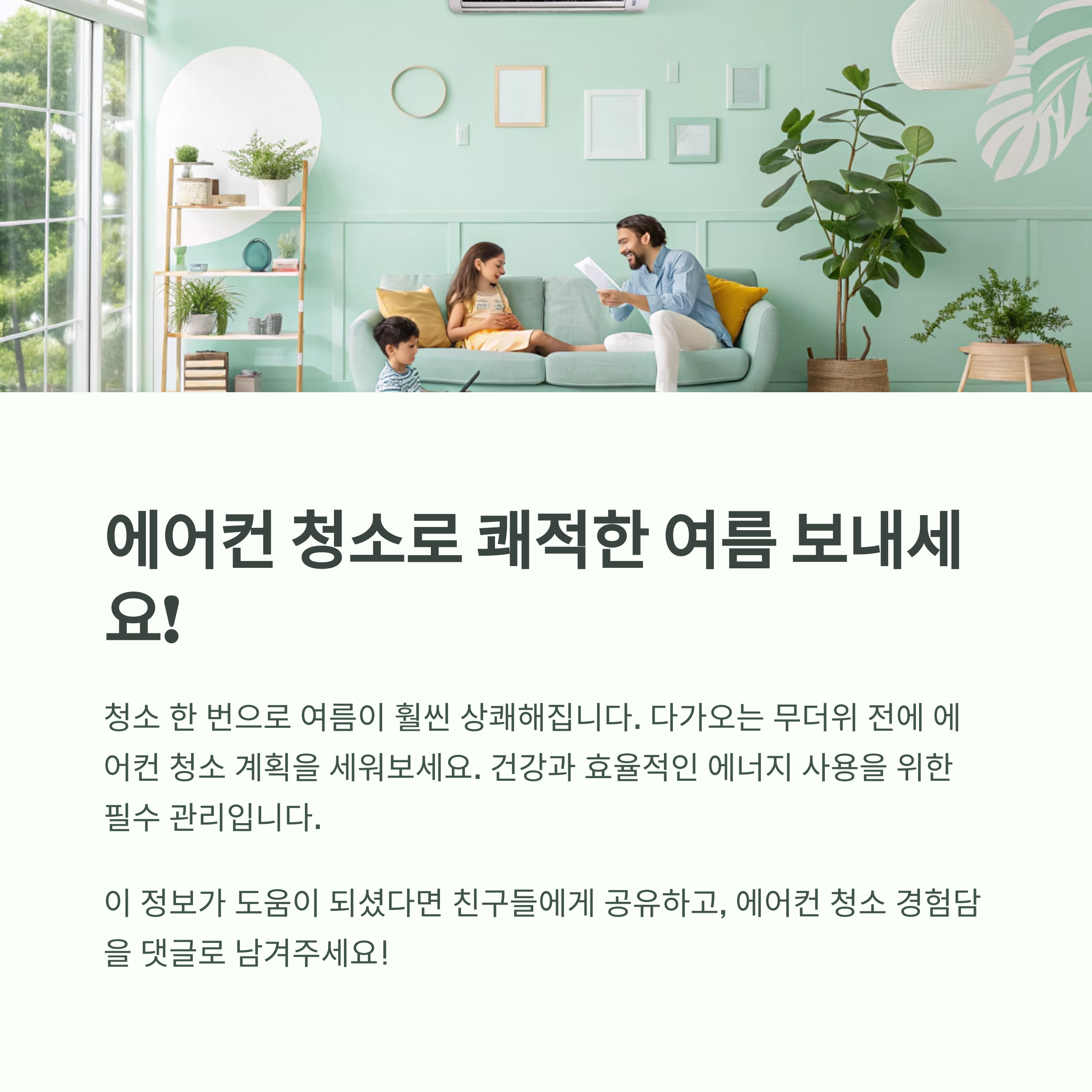 에어컨 청소는 단순히 쾌적함을 위한 선택이 아니라, 건강과 효율적인 에너지 사용을 위한 필수 관리 항목입니다. 오늘 알려드린 정보들을 참고하시면, 불필요한 비용은 줄이고, 꼭 필요한 청소는 합리적으로 받을 수 있을 거예요. 저도 고객분들께 늘 강조하지만, 청소 한 번으로 여름이 훨씬 상쾌해집니다. 다가오는 무더위 전에 한 번쯤, 에어컨 청소 계획 세워보시고 똑똑한 소비로 가정의 공기질을 업그레이드해보세요! 혹시 궁금한 점이나 경험담 있으시면 댓글로 남겨주세요 :)