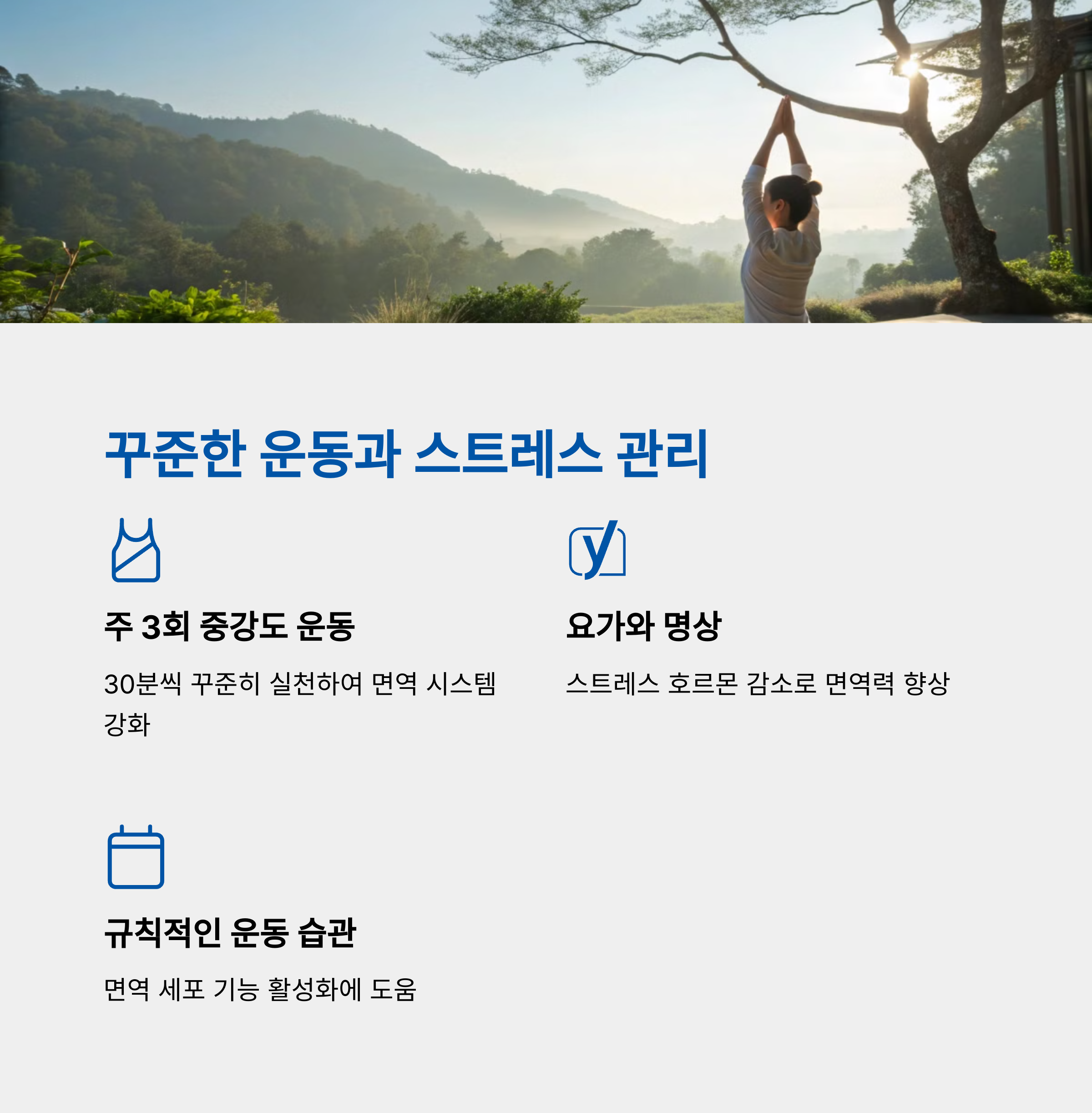 걷기, 요가, 스트레칭도 충분히 면역력 향상에 도움이 됩니다. 중요한 건 꾸준함이에요.