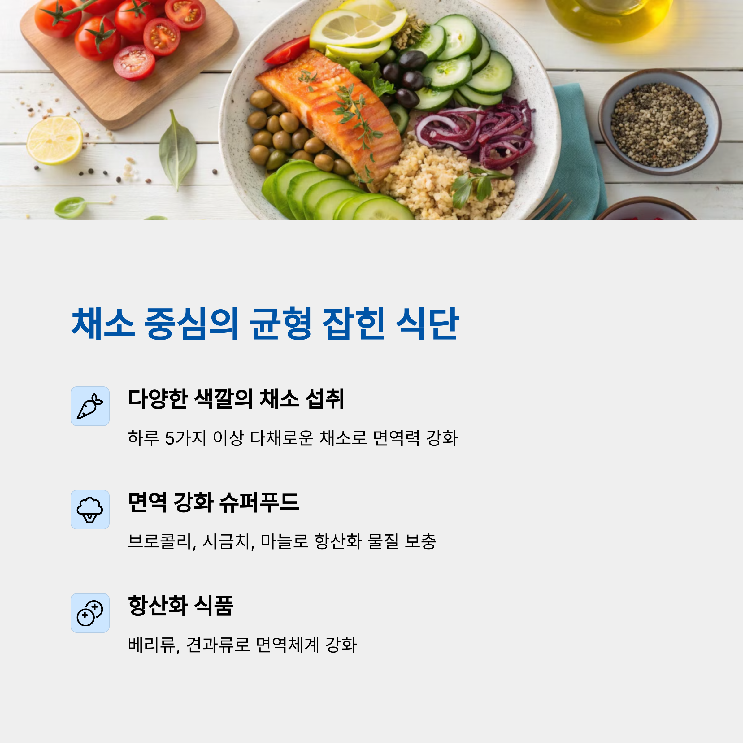 건강한 식단은 면역세포의 활력을 높이고, 병원균 침입 시 신속하게 대응할 수 있는 힘을 길러줍니다.