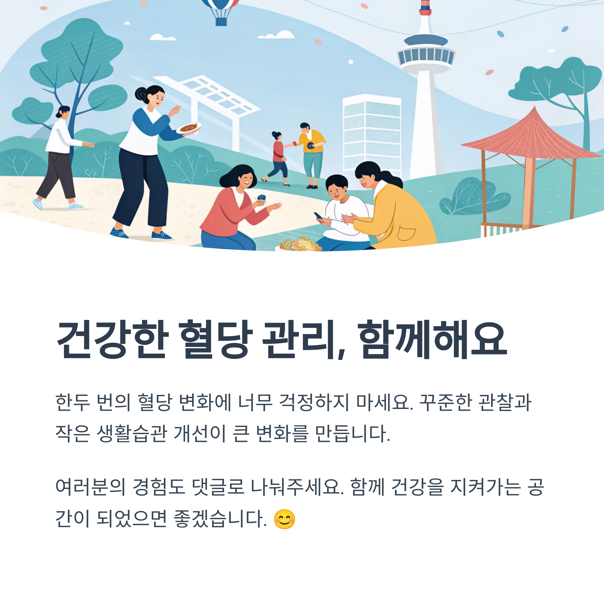 지금까지 아침 공복혈당이 높은 이유와 식후 혈당의 정상 범위에 대해 살펴봤어요. 한두 번의 혈당 변화에 너무 걱정하기보다는, 꾸준한 관찰과 생활습관 개선이 더 중요하다는 점 기억해주세요. 저도 처음엔 막막했지만, 작은 실천 하나가 큰 변화를 만들더라고요. 혹시 여러분도 비슷한 경험이 있다면 댓글로 나눠주세요. 함께 건강을 지켜가는 공간이 되었으면 좋겠어요. 😊